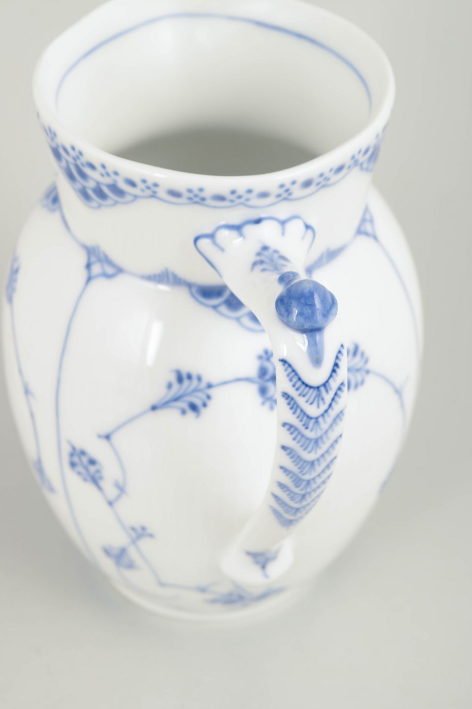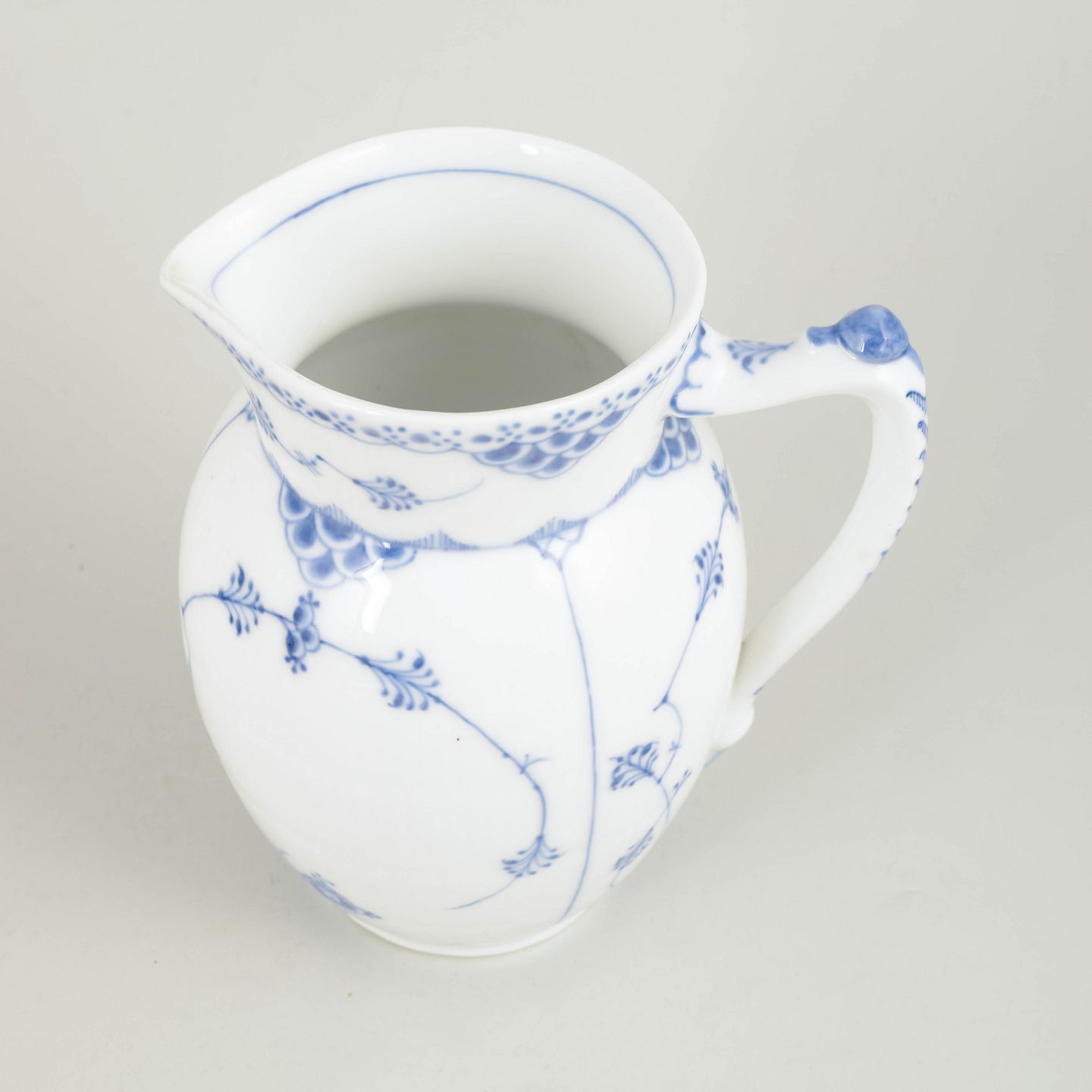 Royal Copenhagen Blue Fluted Half Lace pitcher.Pitcher in hand-painted porcelain from Blue Fluted Half Lace with classic underglaze decoration in cobalt blue, fluted panels and characteristic lace border. Model 1/562.
