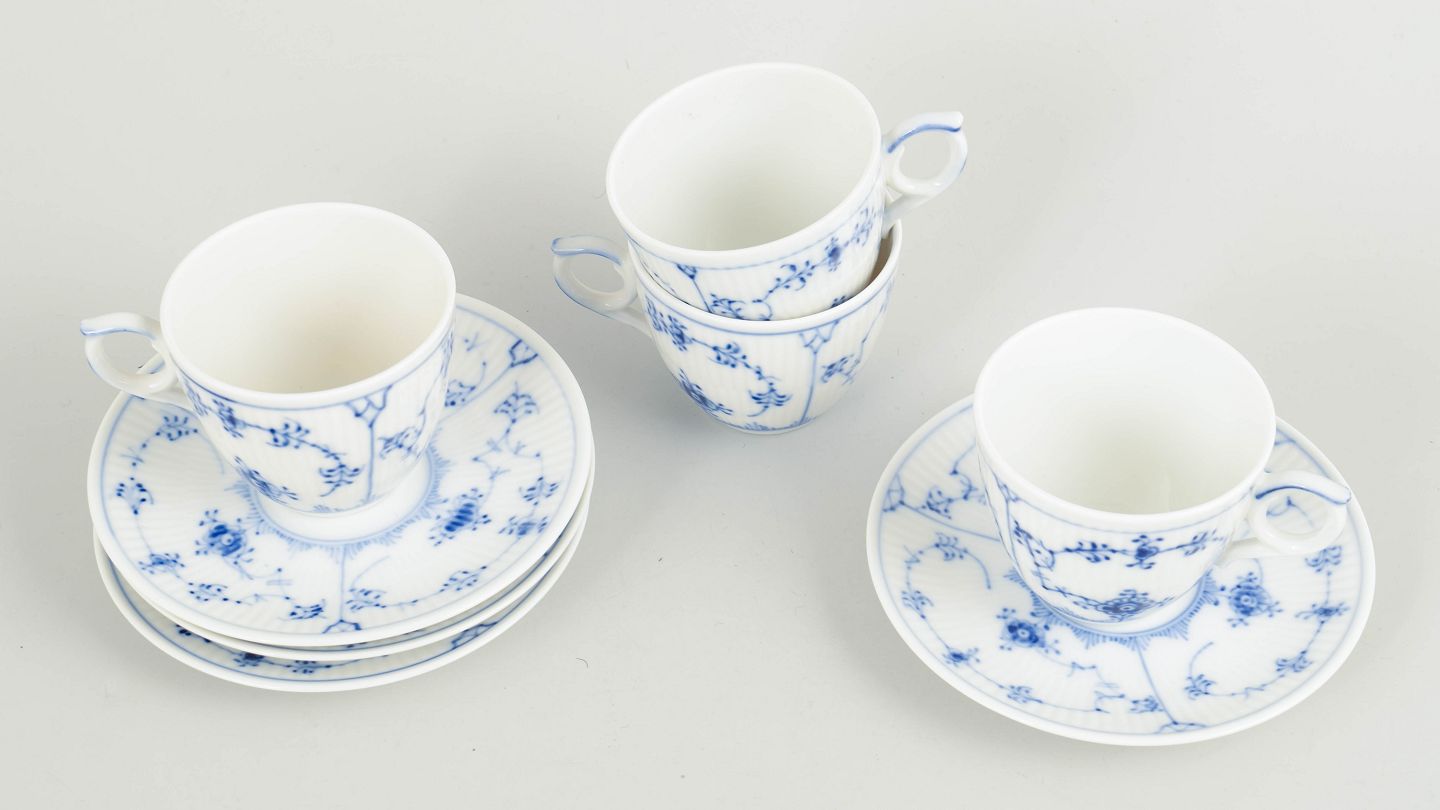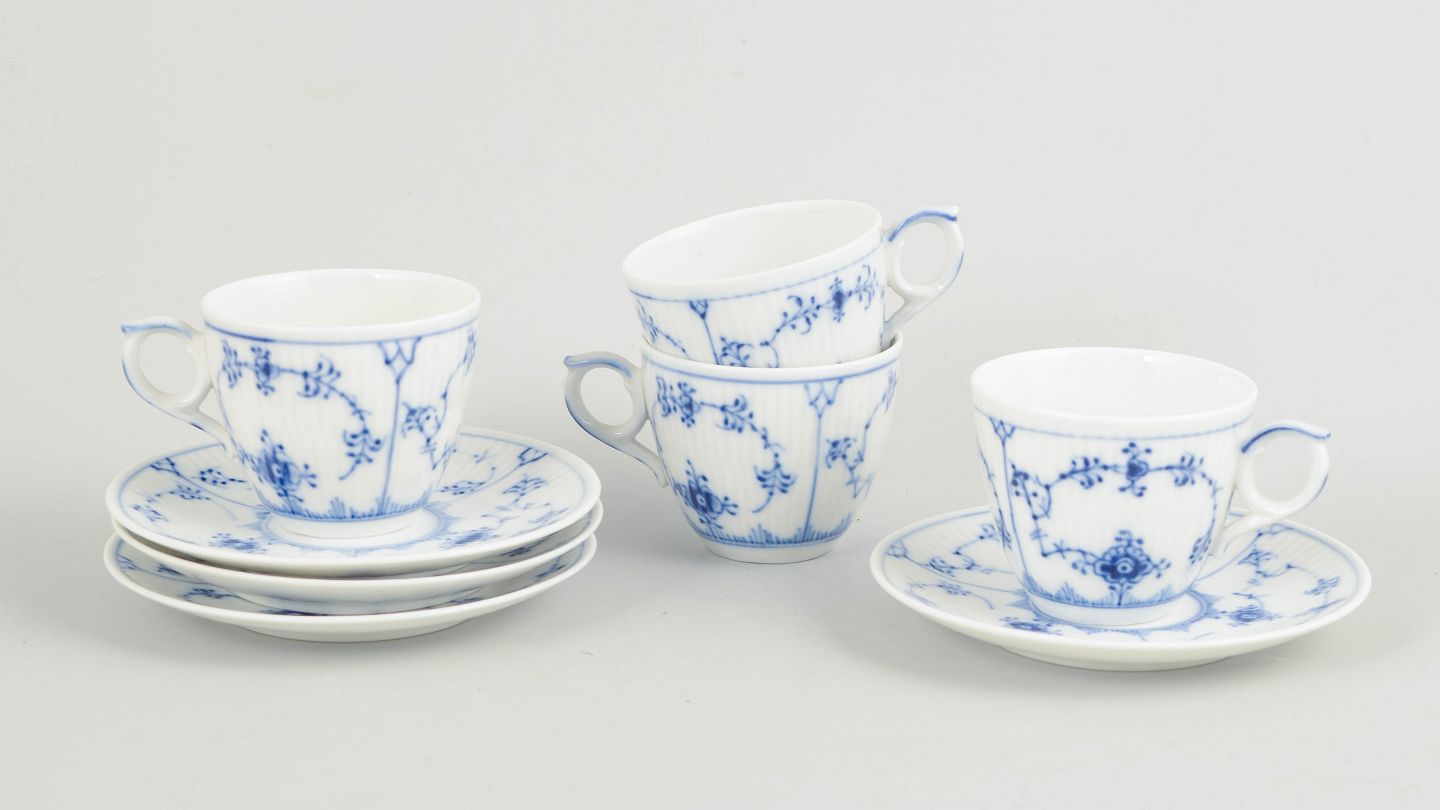 Set of four demitasse cups with matching saucers in hand-painted porcelain from Blue Fluted Plain with classic underglaze decoration in cobalt blue.