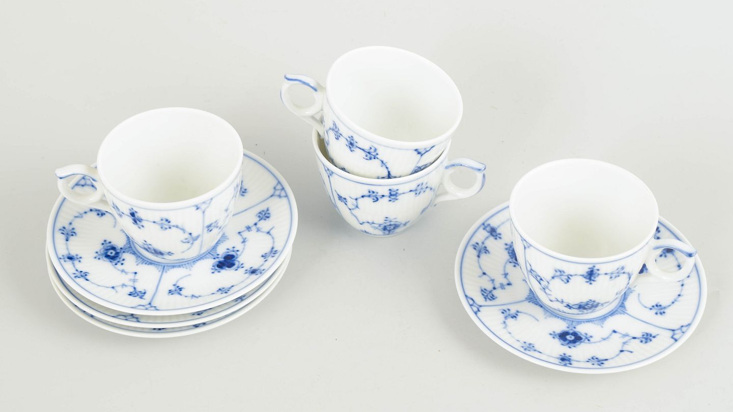 Set of four demitasse cups with matching saucers in hand-painted porcelain from Blue Fluted Plain with classic underglaze decoration in cobalt blue. Model 1/298.