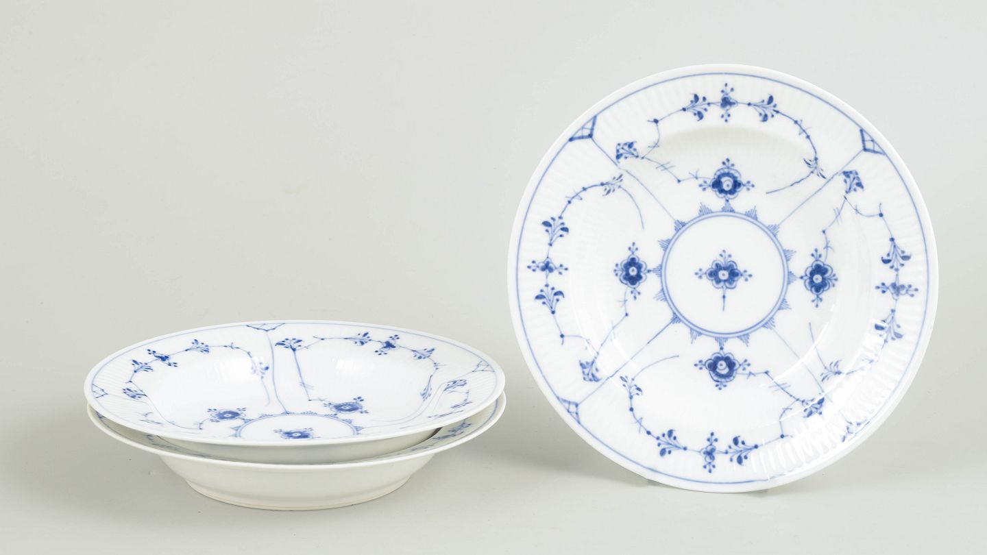 Royal Copenhagen Blue Fluted Plain, set of three pasta plates.Set of three deep plates in hand-painted porcelain from Blue Fluted Plain with classic underglaze decoration in cobalt blue. Model 1/170. First factory quality.