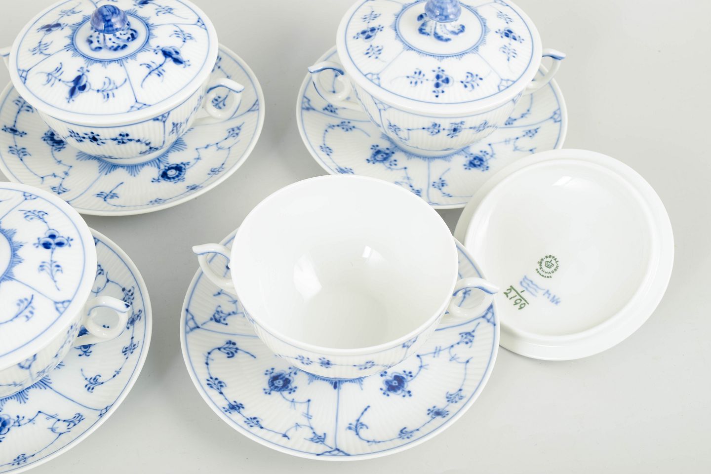 Royal Copenhagen Blue Fluted Plain, set of four bouillon cups with matching saucers.Set of four bouillon cups with matching saucers in hand-painted porcelain from Blue Fluted Plain with classic underglaze decoration in cobalt blue. Model 1/2199. Some pieces are first factory quality, others are cancelled with one incised line on the base.
