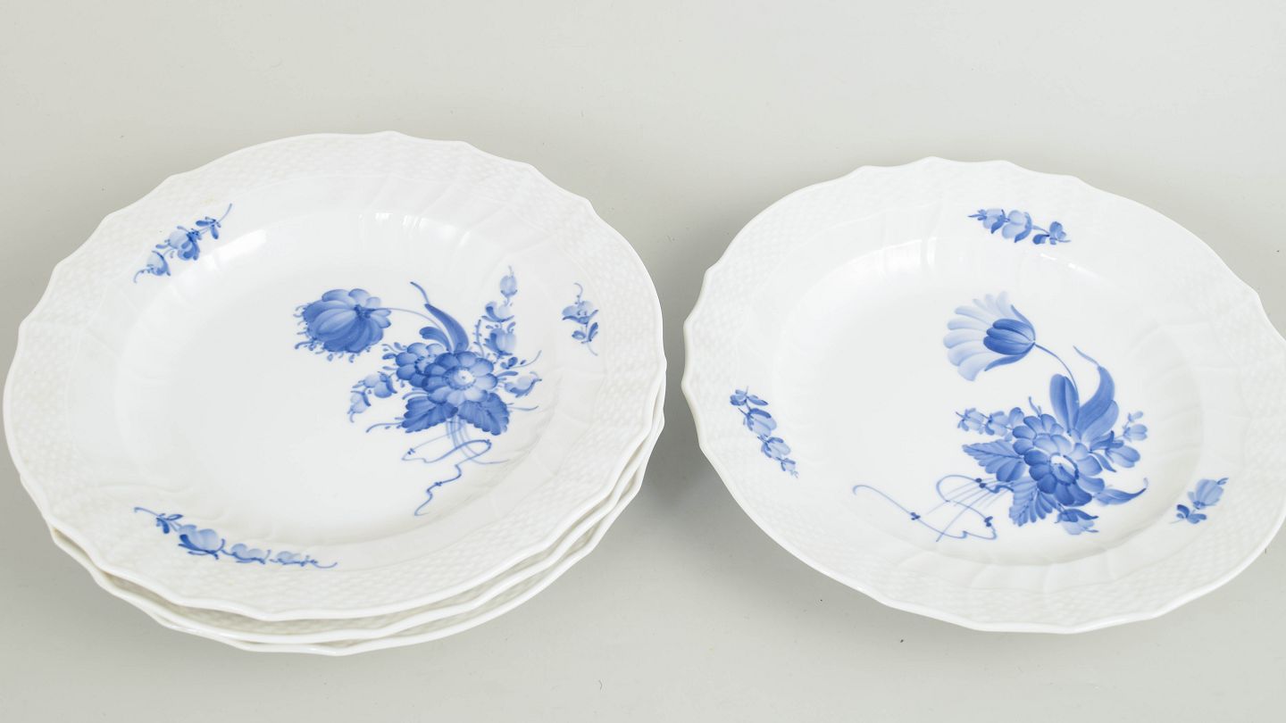 Royal Copenhagen Blue Flower Curved, set of four dinner plates.Set of four hand-painted porcelain dinner plates from the Blue Flower Curved service with classic underglaze decoration in cobalt blue featuring a naturalistic floral motif and curved form. Model 10/1621. First factory quality. Produced in 1957.