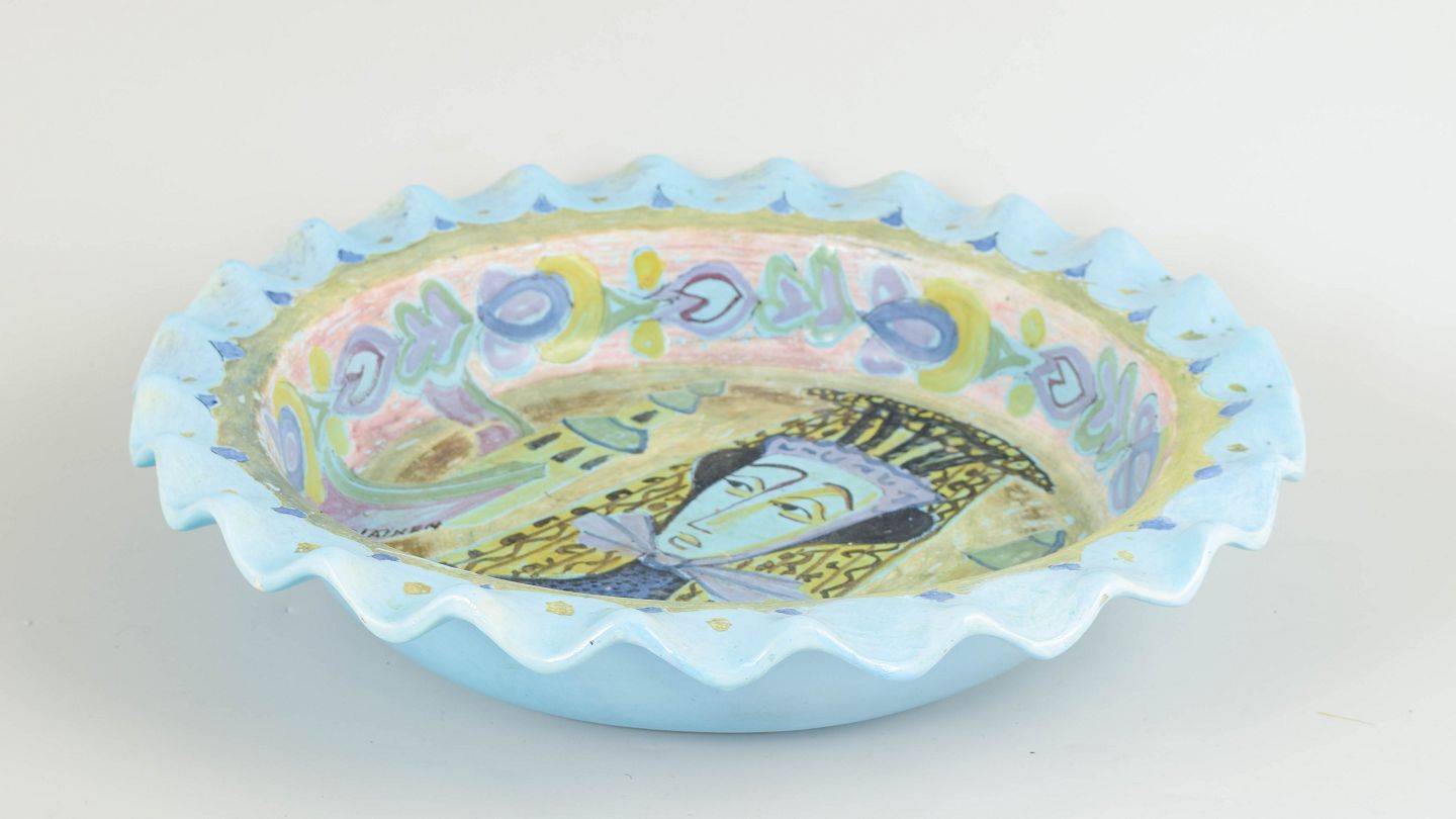 Birger Kaipiainen for Arabia, large unique bowl.Large hand-decorated ceramic bowl with scalloped rim and polychrome decoration depicting a stylised female figure surrounded by ornamental motifs.