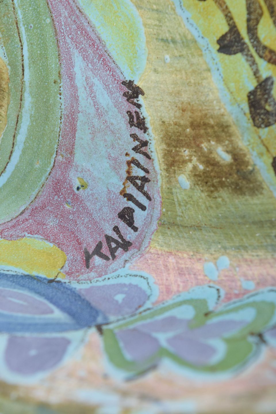 Birger Kaipiainen (1915–1988) was a Finnish ceramic artist and designer, regarded as one of the most important artists associated with Arabia. He studied at the Central School of Applied Arts in Helsinki and worked at Arabia from 1937 onward. Kaipiainen is especially known for his richly decorated works with figurative and ornamental motifs, and his unique pieces are considered among the finest examples of twentieth-century Finnish ceramic art.
