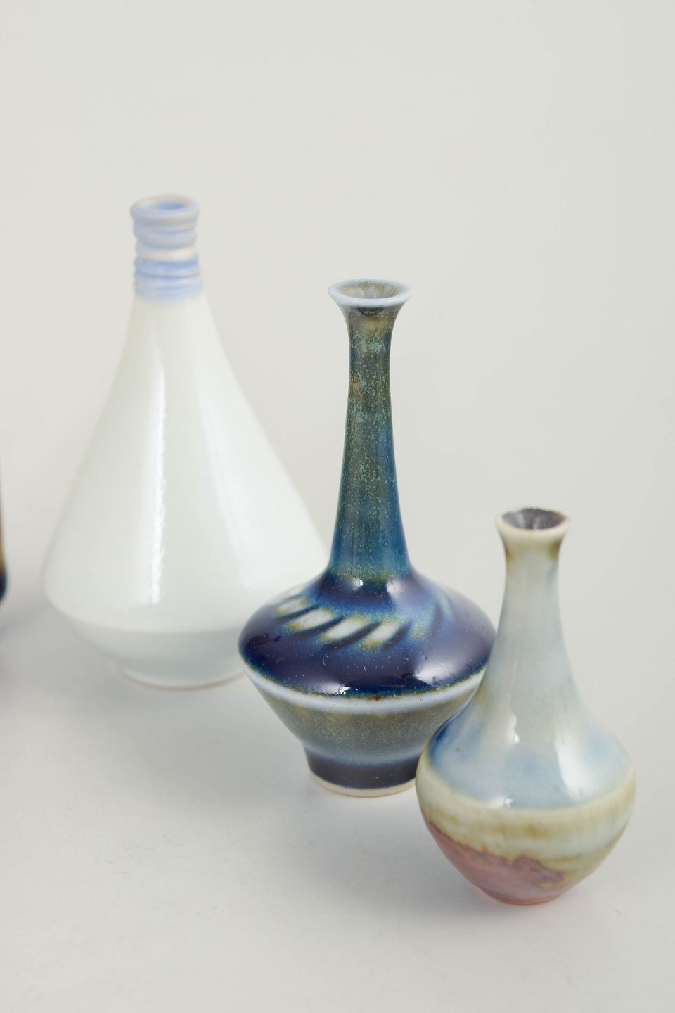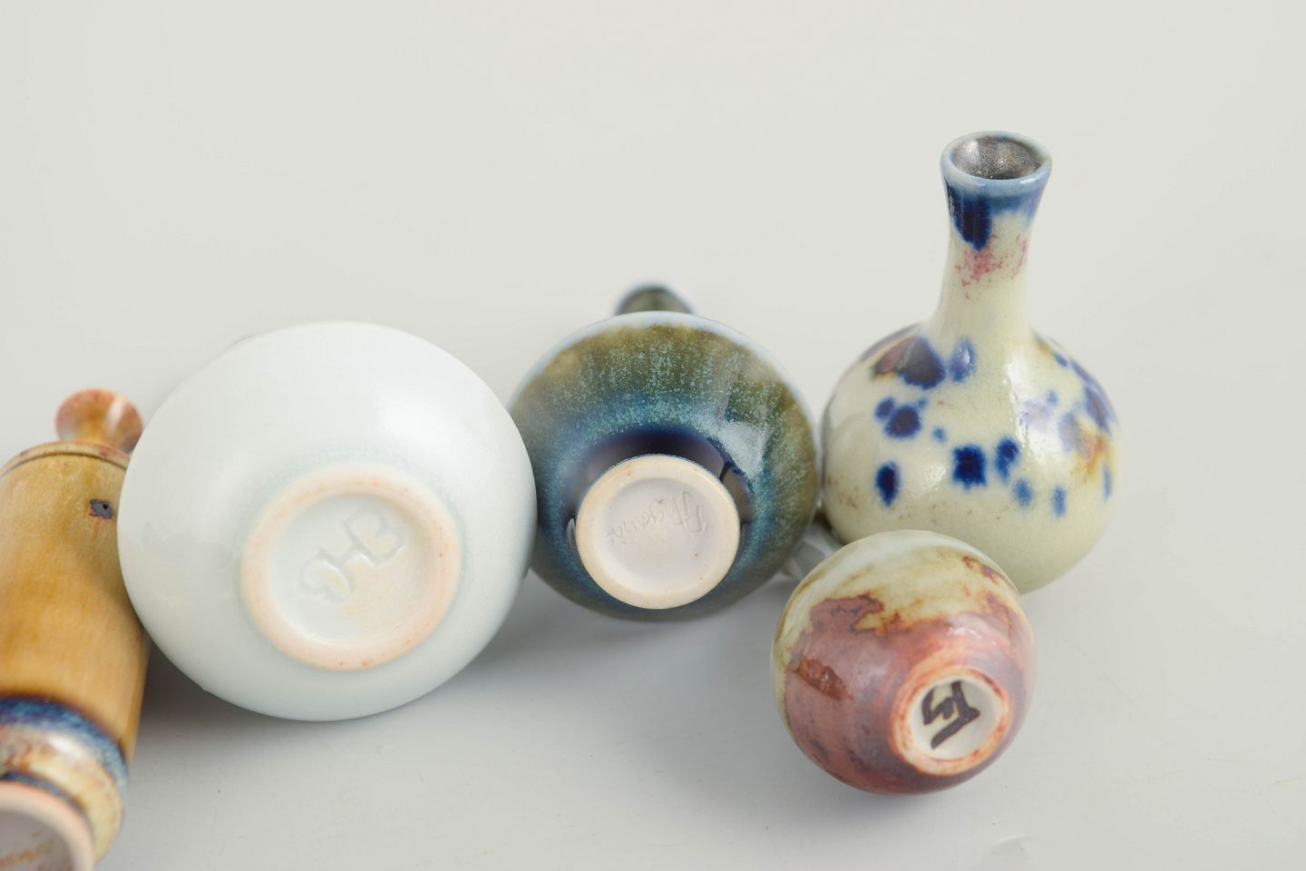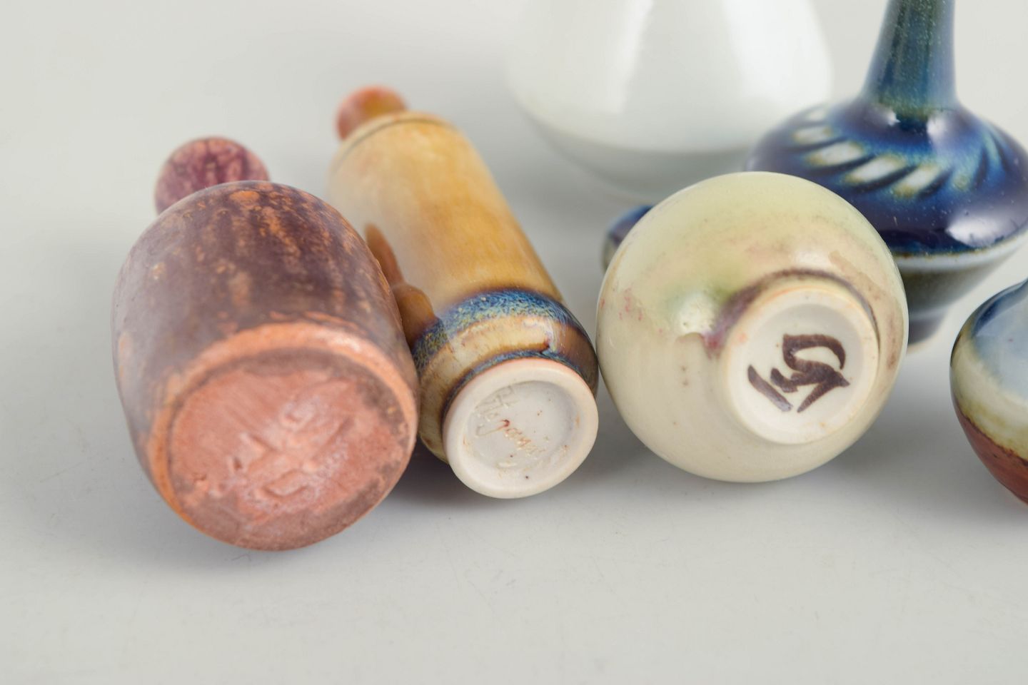 Set of six miniature ceramic vases.Collection of six miniature ceramic vases in varied forms and glazes. Made in ceramic with multicoloured glazes in blue, brown and light tones. All examples are marked on the base. Examples are from Höganäs and others from various makers.
