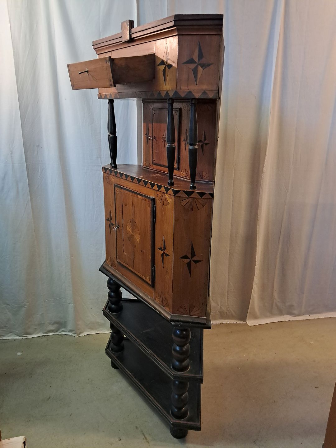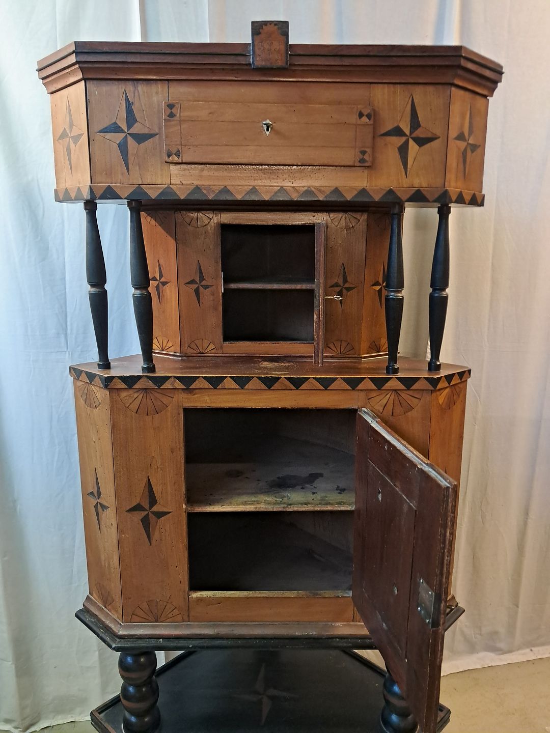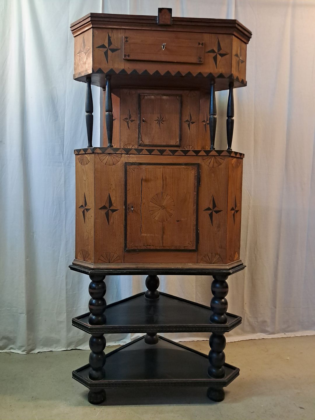Hjørneskab i ege og elmetræ, det har 200 års jubilæumDet har brugsspor.