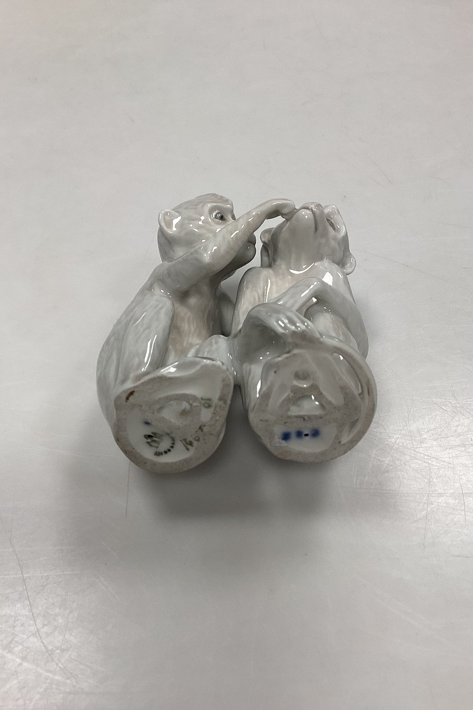 Bing and Grøndahl Figurine Monkey Pair No. 1667 or 1524. Designed by Ingeborg Plockross Irminger. The figurine is numbered with the figurine number of the right monkey. Color: gray-white.Measures 8.2 cm / 3.23 in. 1st Quality.
