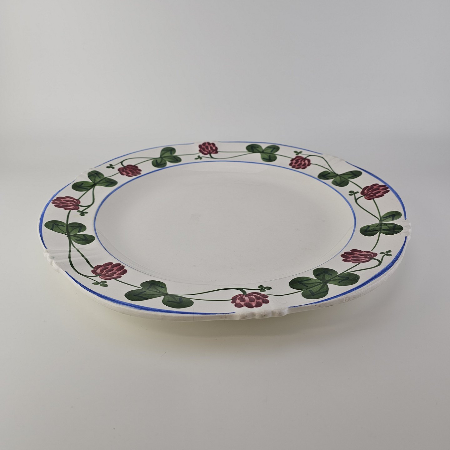 Rundt fad i kunstfajance fra stellet Kløver. Nr. 181/313Formgiver H. Slott-Møller år 1904