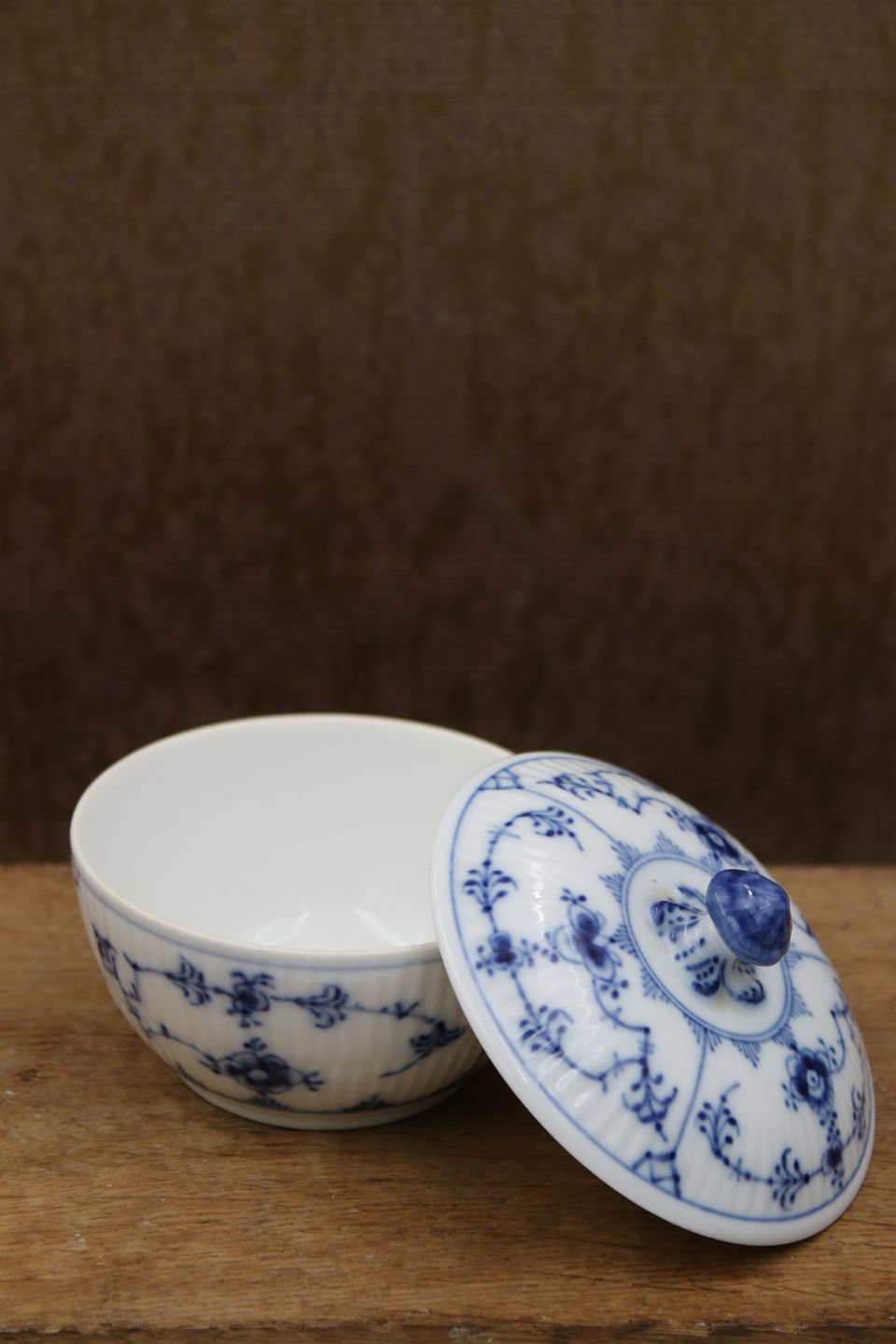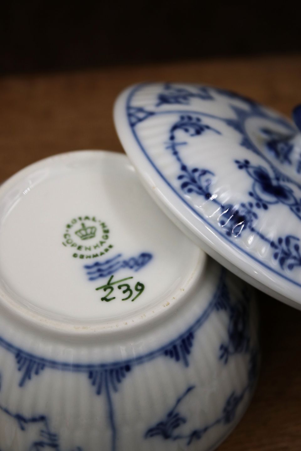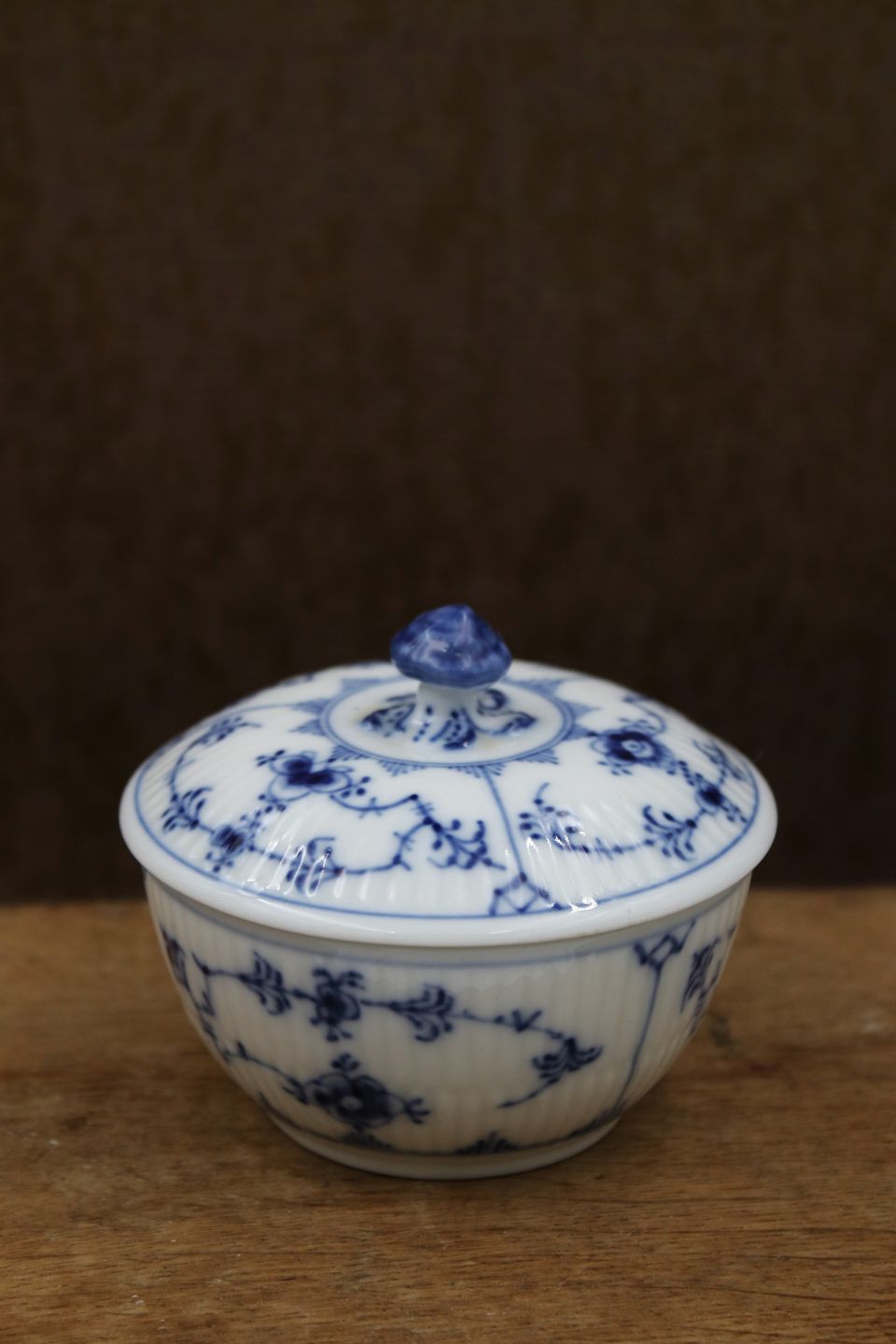 Royal Copenhagen Blue Fluted Plain sugar bowl with lid.H: 7cm. Dia.: 9cm. Decoration number: 1/239. 1.sort.