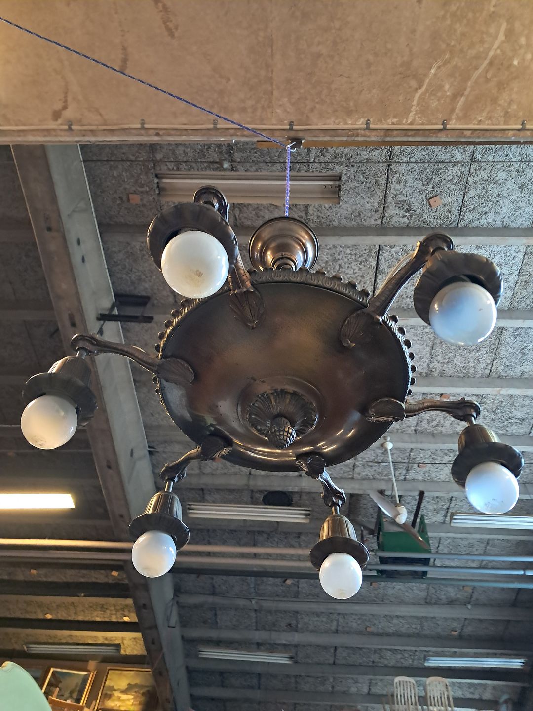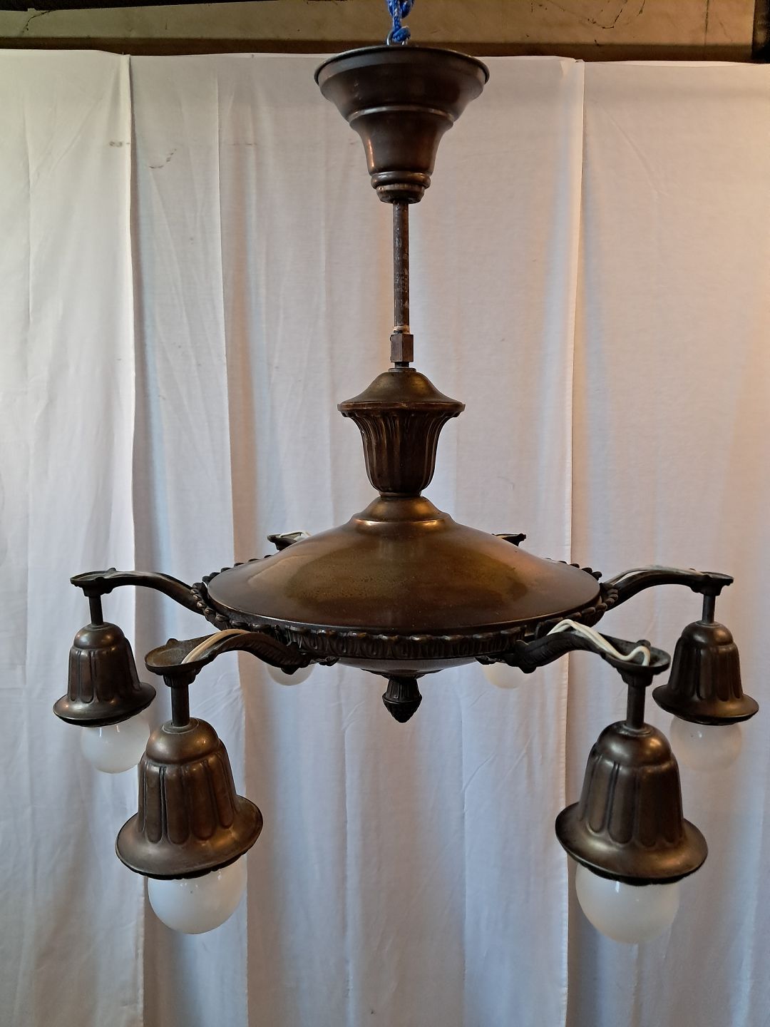 Lysekrone i bruneret messing, fra 1930erne.Den har brugsspor.