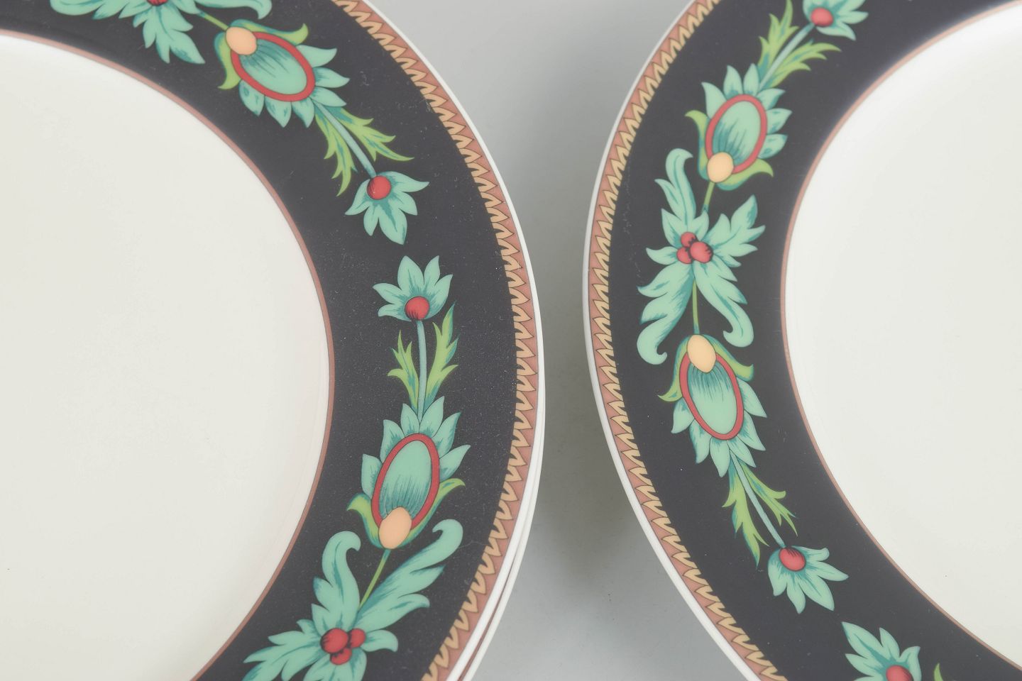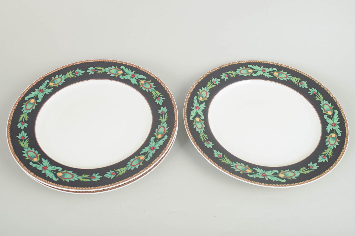 Nina Campbell for Rosenthal, set of three dinner plates.Set of three porcelain dinner plates with a decorative border in green and gilt tones against a dark ground. The plates were produced by Rosenthal after a design by Nina Campbell.