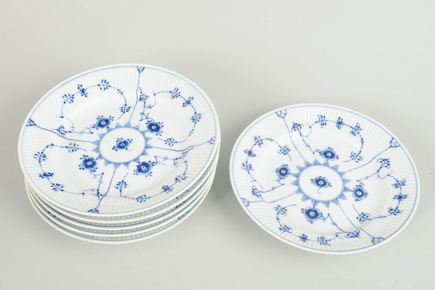 Royal Copenhagen Blue Fluted Plain set of six salad/lunch plates.Set of six salad or lunch plates in hand-painted porcelain from the Blue Fluted Plain service with classic underglaze cobalt blue decoration and fluted surfaces.