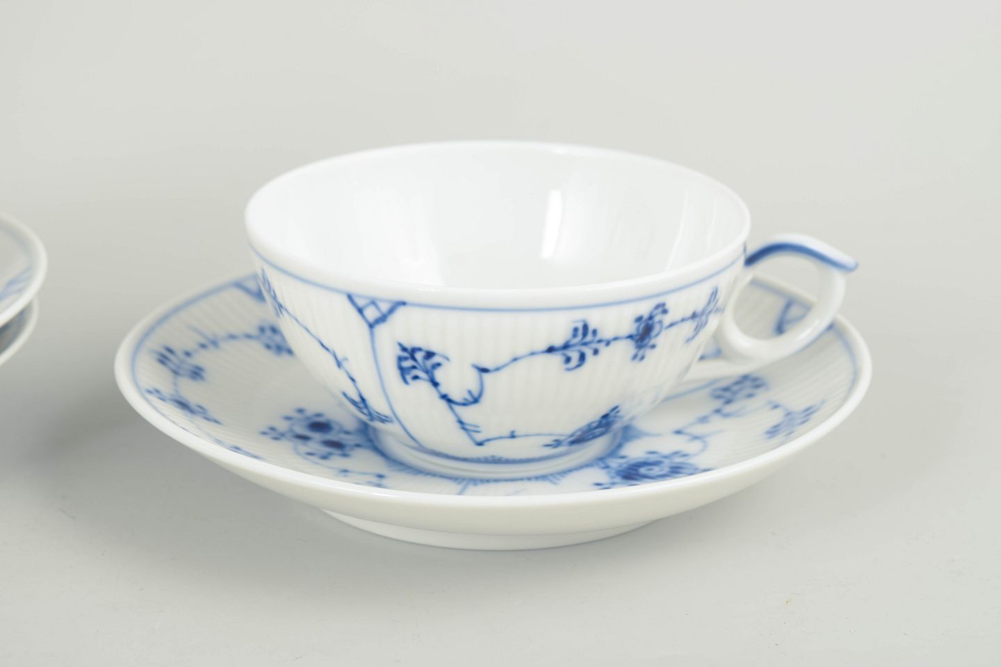 Royal Copenhagen Blue Fluted Plain set of three tea cups with matching saucers.Set of three tea cups with matching saucers in hand-painted porcelain from the Blue Fluted Plain service with classic underglaze cobalt blue decoration and fluted surfaces. Model 1/76. Cups H. 5 cm, D. 12 cm. Saucers D. 15 cm. First factory quality. Produced in the 1960/80s.