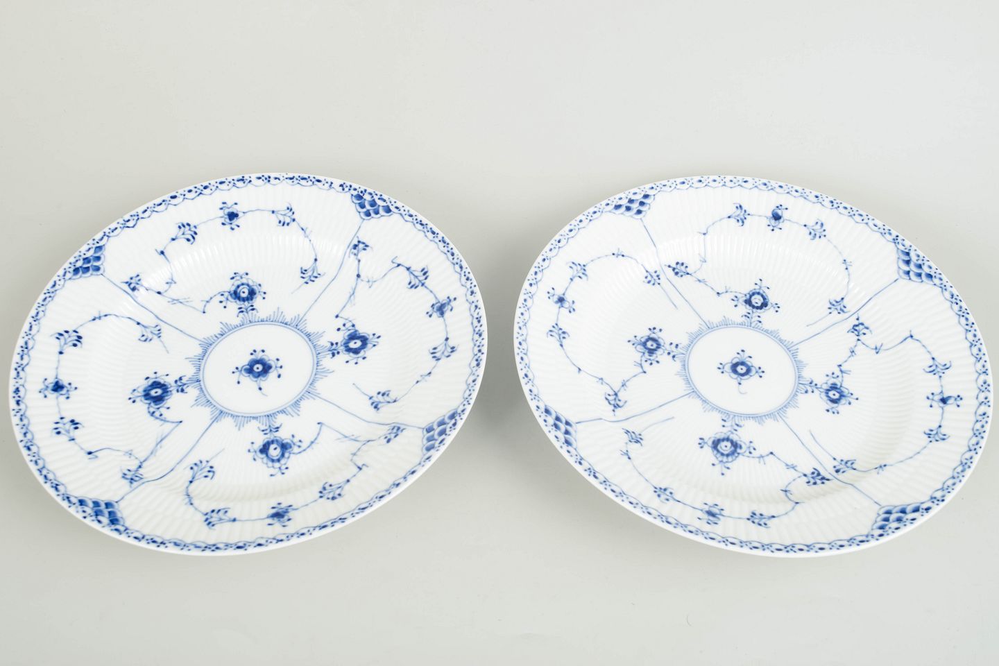 Royal Copenhagen was founded in 1775 in Copenhagen under royal patronage. The factory is internationally renowned for its hand-painted porcelain and high artistic standards. Blue Fluted Half Lace is a development of the classic Blue Fluted service, combining fluted surfaces with a decorative lace border and finely detailed hand-painted decoration.