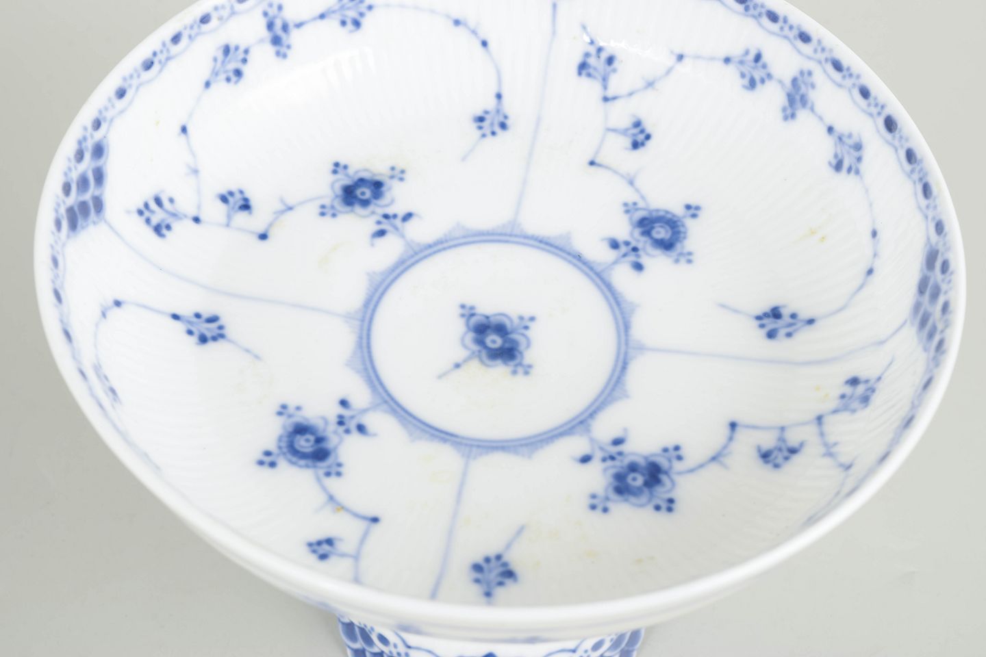 Royal Copenhagen Blue Fluted Half Lace compote.Compote in hand-painted porcelain from the Blue Fluted Half Lace service with classic underglaze cobalt blue decoration and characteristic lace rim. Model 1/513 and 1/514. H. 14 cm, D. 21 cm. First factory quality. Produced in the 1920s.