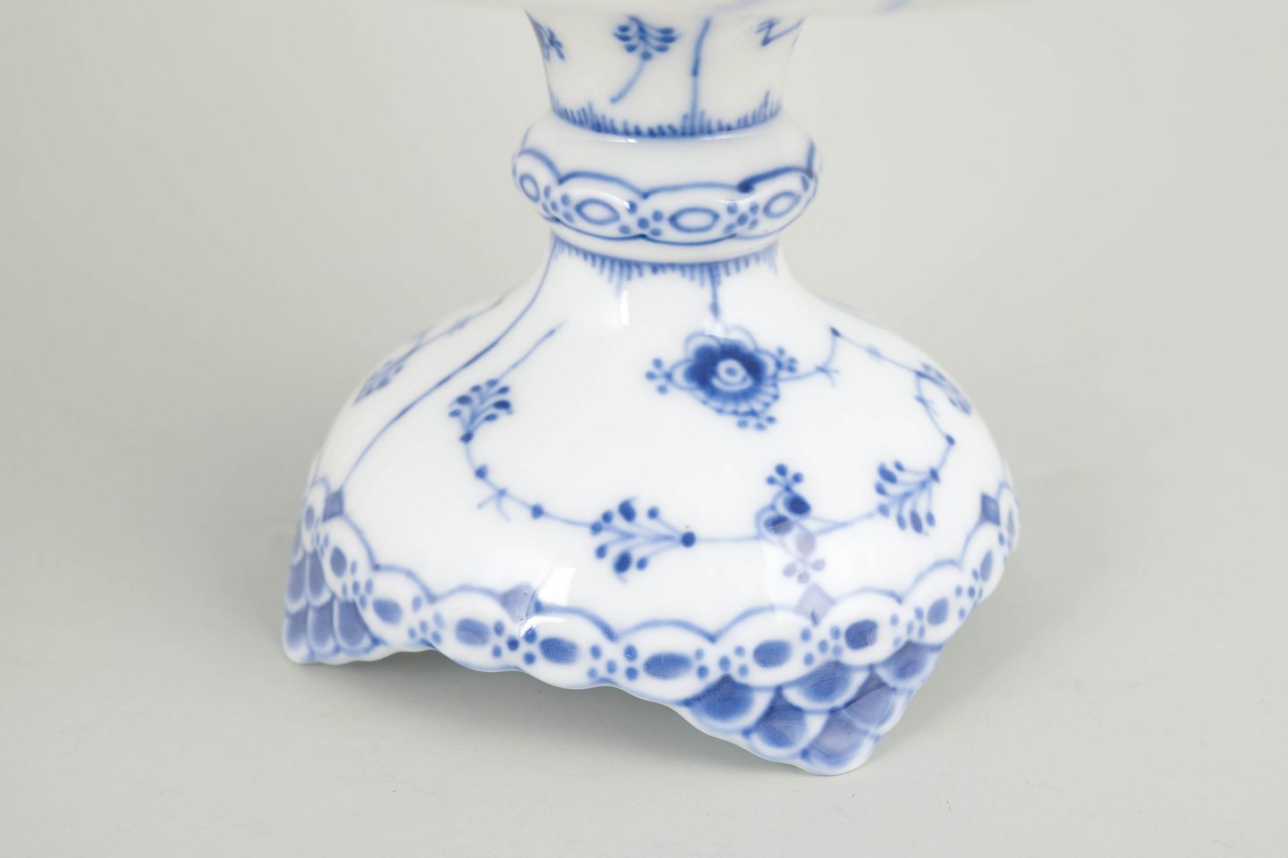 Royal Copenhagen was founded in 1775 in Copenhagen under royal patronage. The factory is internationally renowned for its hand-painted porcelain and high artistic standards. Blue Fluted Half Lace is a development of the classic Blue Fluted service, combining fluted surfaces with an openwork lace border and finely detailed hand-painted decoration.