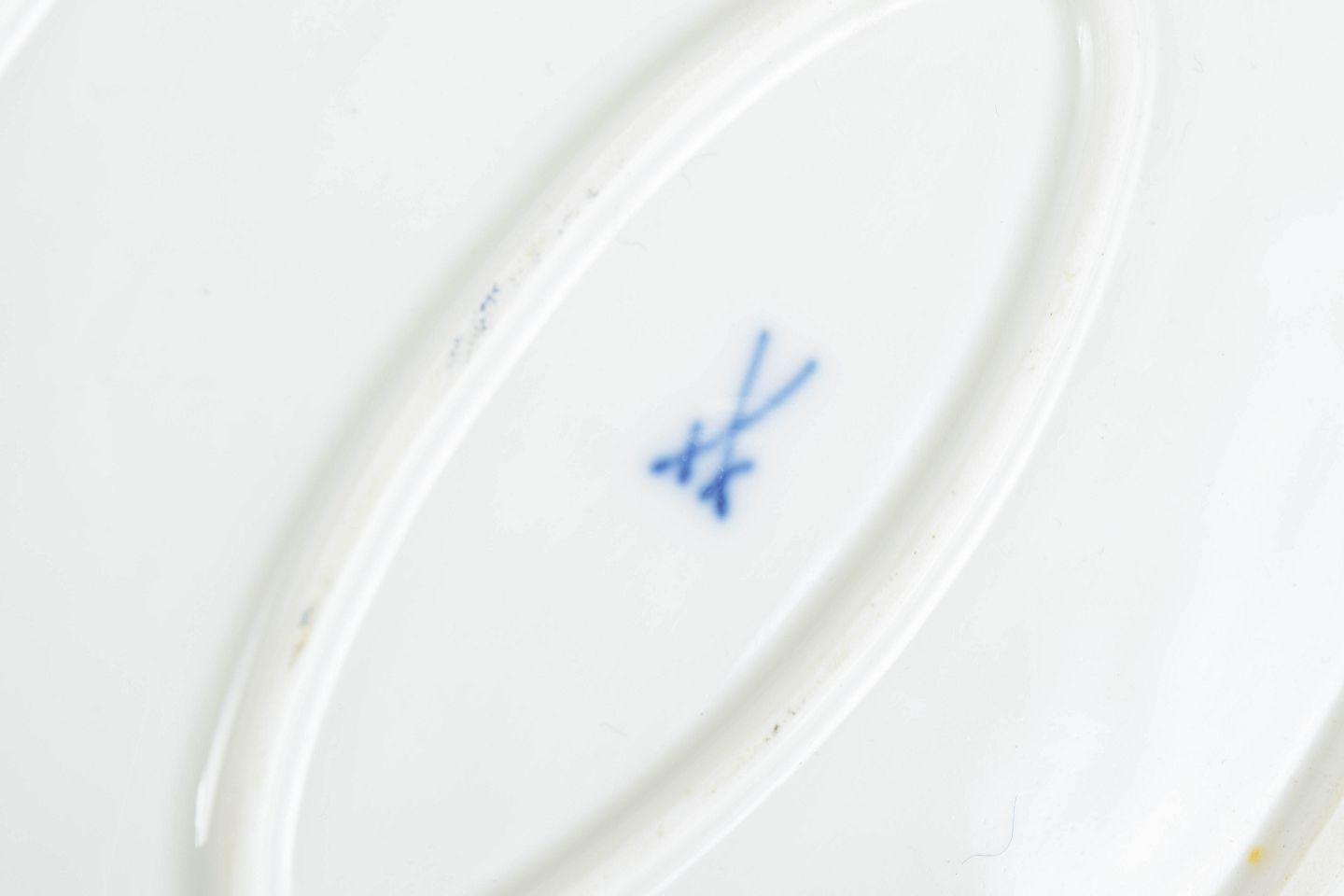 Oval serving dish in hand-painted porcelain with Blue Orchid decoration. Produced by Meissen and marked with the Meissen crossed swords. Cancelled with two incised lines on the underside.