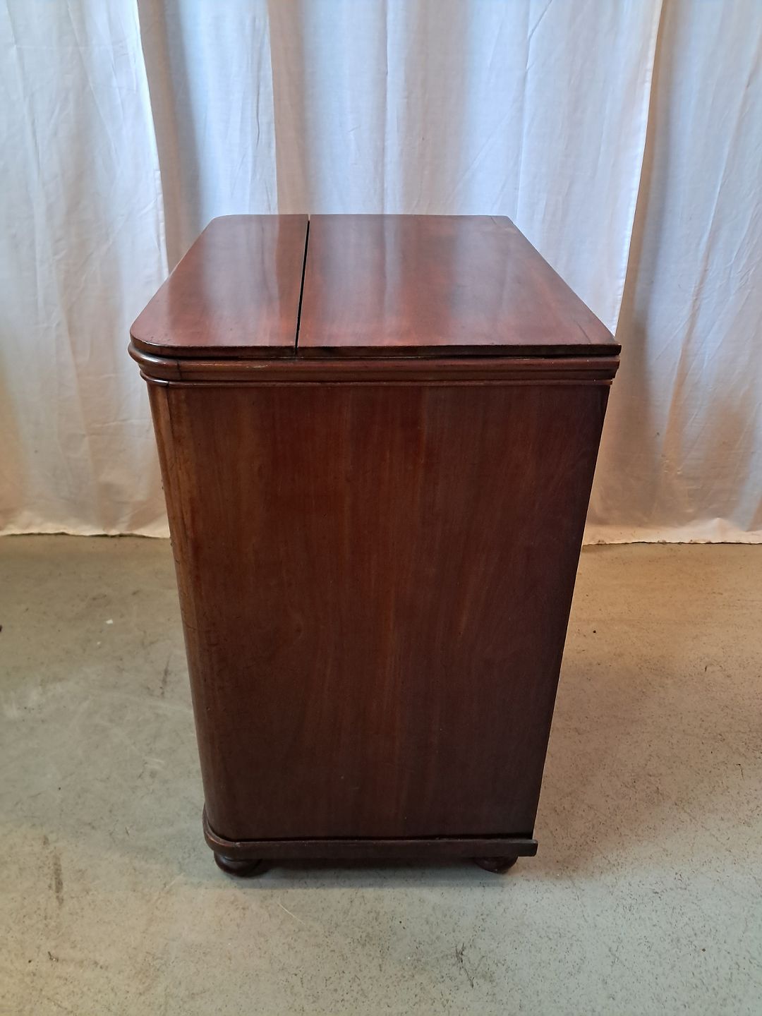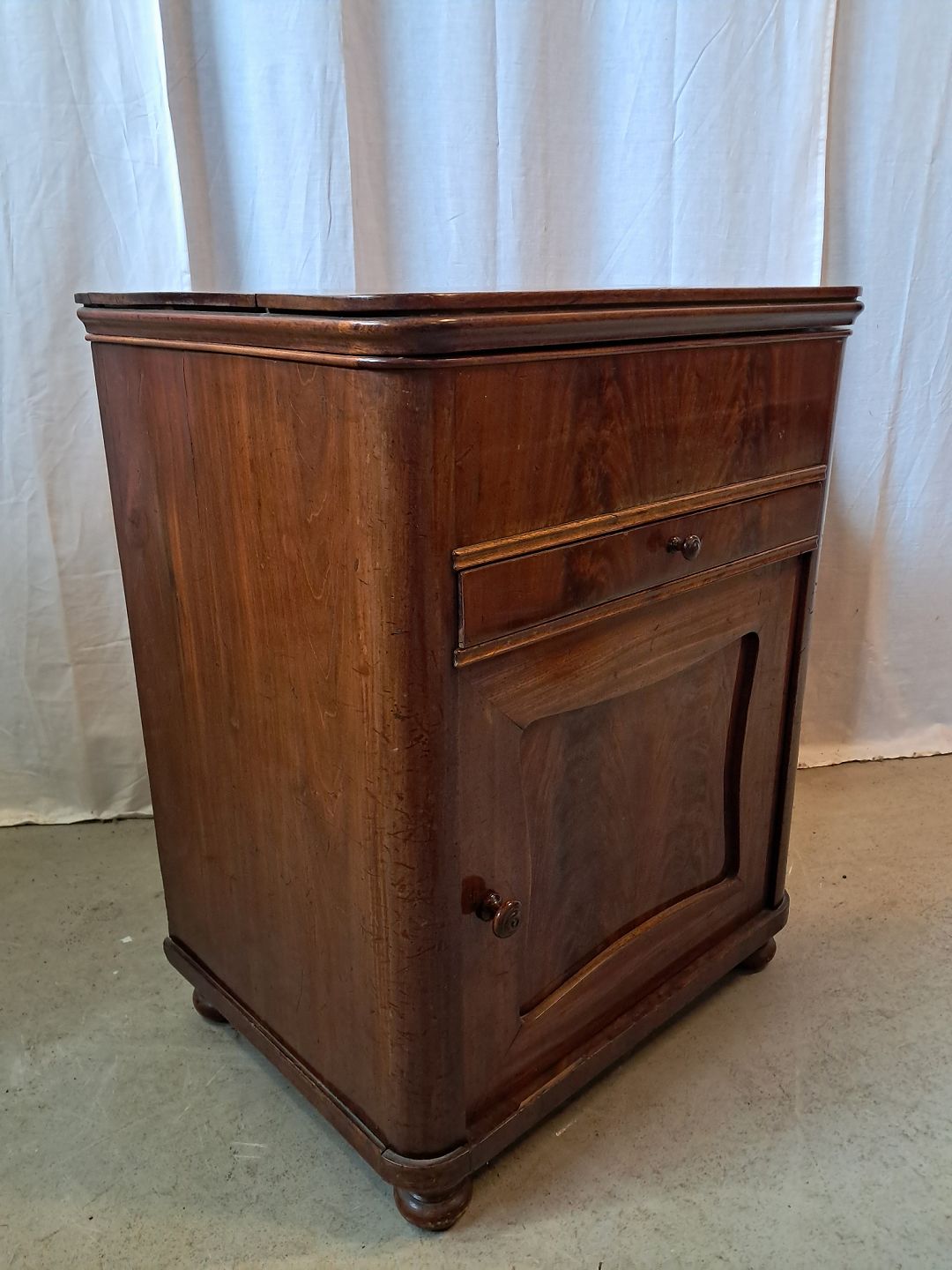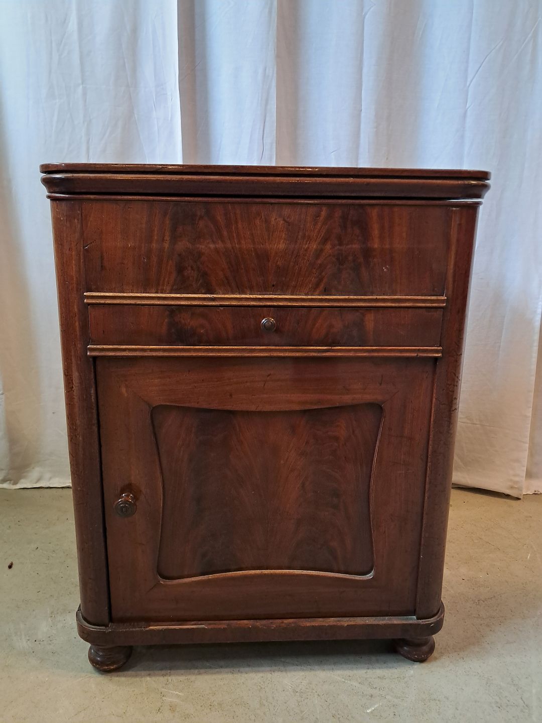 Servante i fineret mahogni, fra 1910erne.Den har brugsspor og en revne i toppladen.