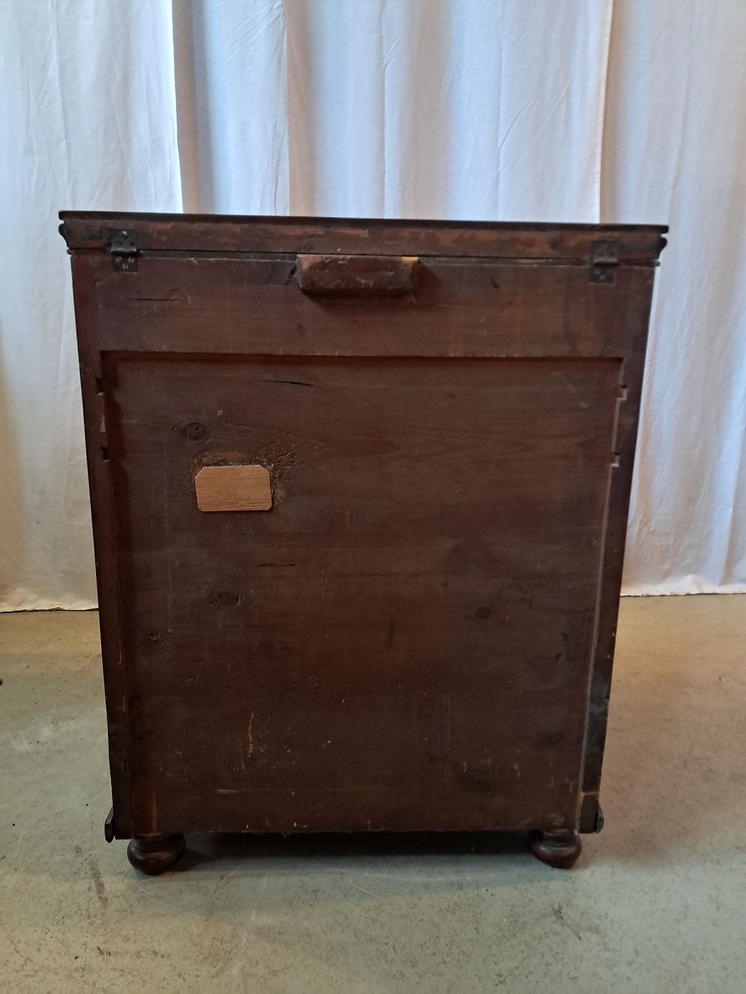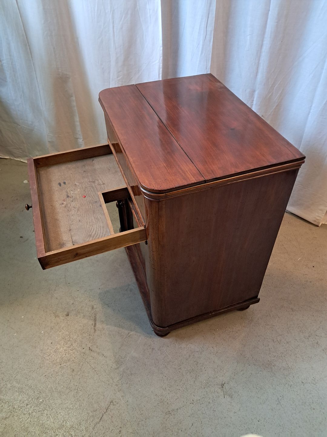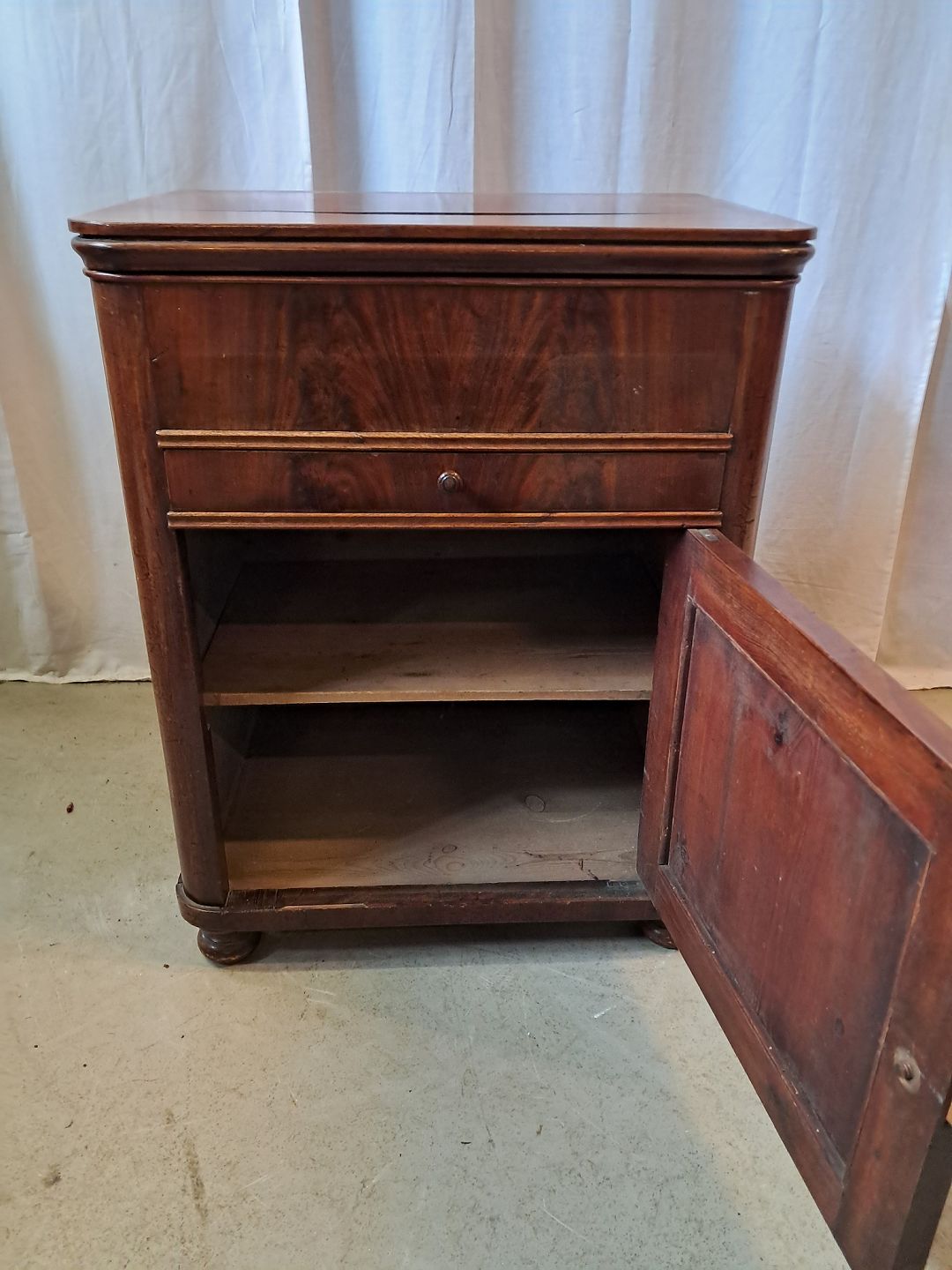 Servante i fineret mahogni, fra 1910erne.Den har brugsspor og en revne i toppladen.
