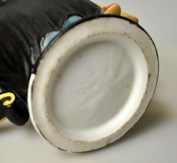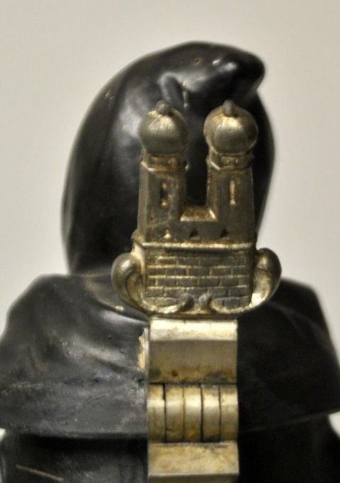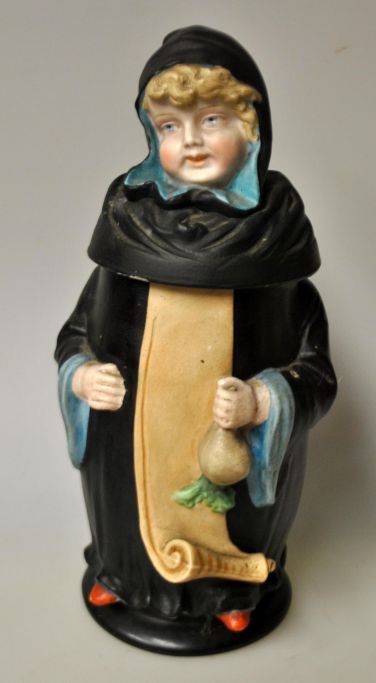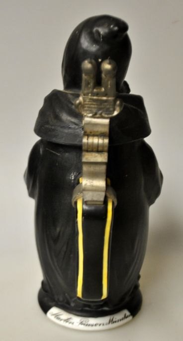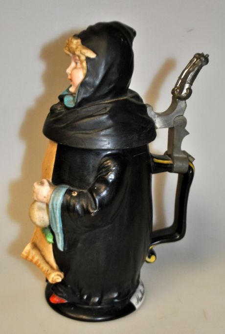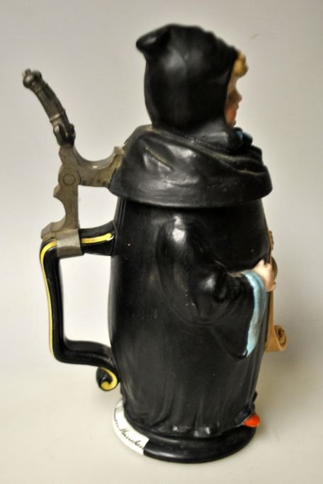 Martin Pauson (1861 - 1934) Germany: Beer stein with "Münchner Kindl", which is a monk. Hand-painted bisque porcelain. Mug with handle and spout of pewter, in the shape of the Frauenkirche. At the bottom lithophane with city motif. Signed: Martin Pauson, Munich. Height.: 22 cm.Perfect condition!