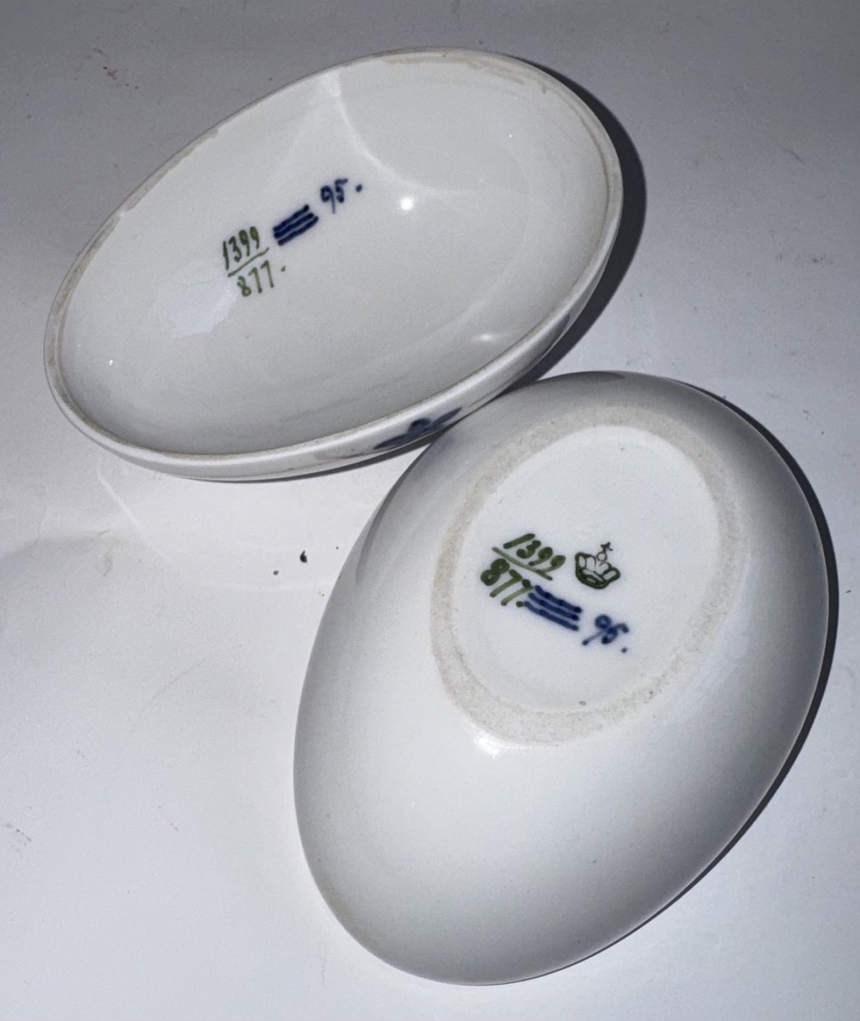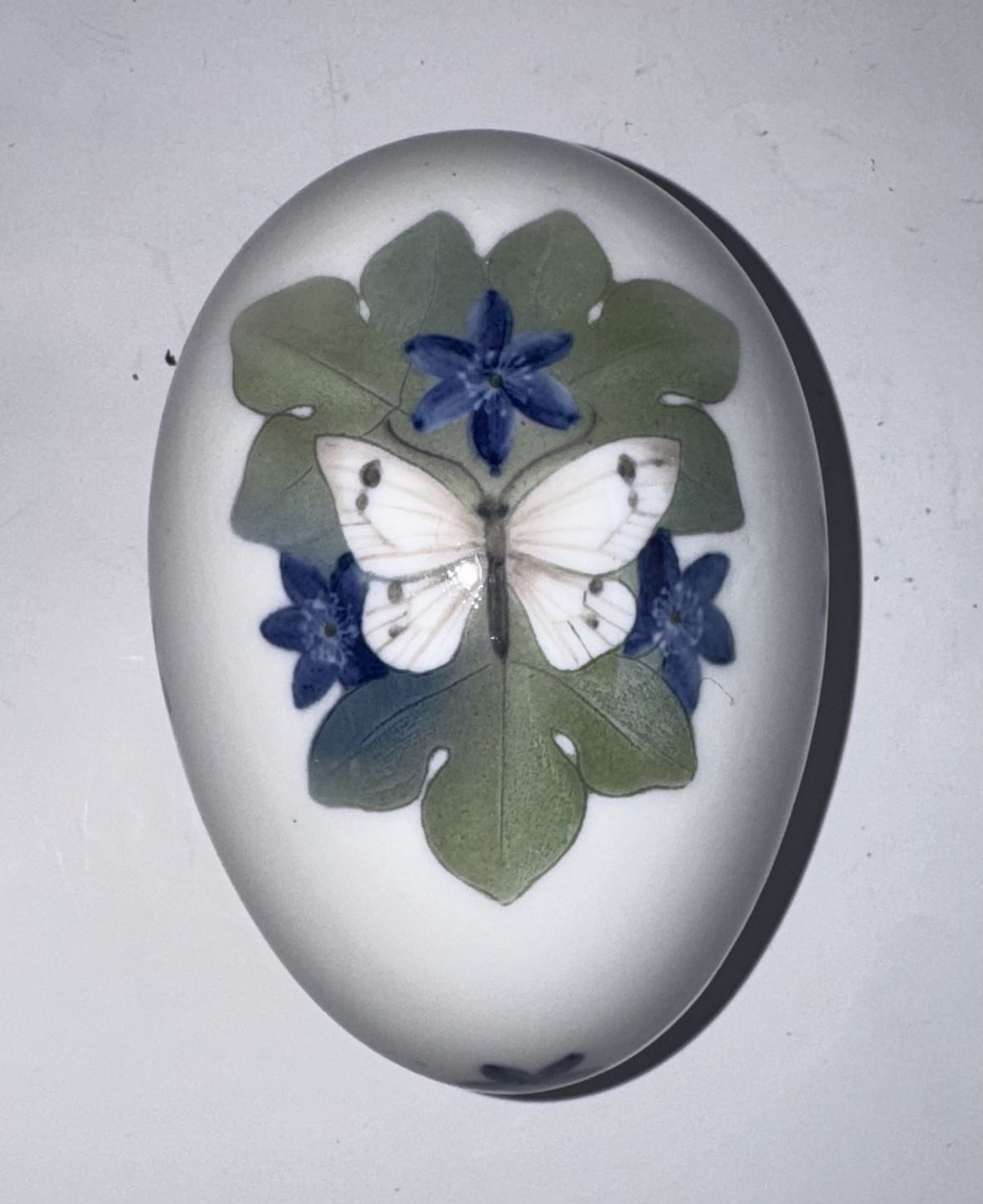 Two-part egg in porcelain, bottom and lid, from Royal Copenhagen. Decorated with a butterfly and flowers. Factory first quality. In good condition. Both parts factory marked with factory logo and model number 1399/877. Manufactured around 1920. Dimensions: H. 7.2 cm, W. 7 cm L. 10 cm. Dealer