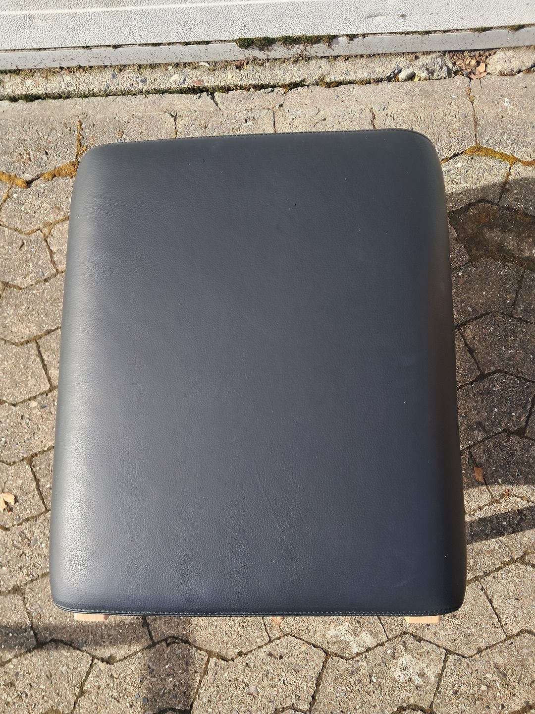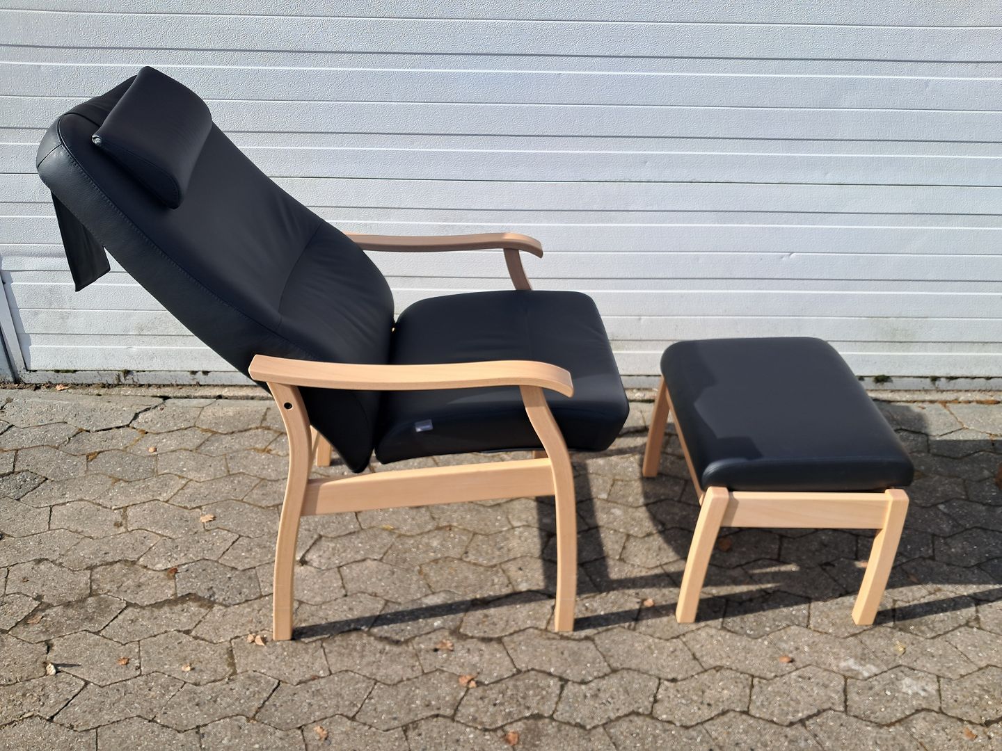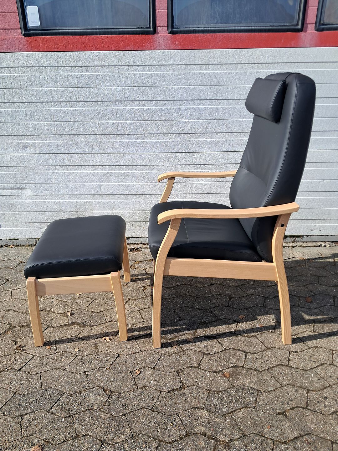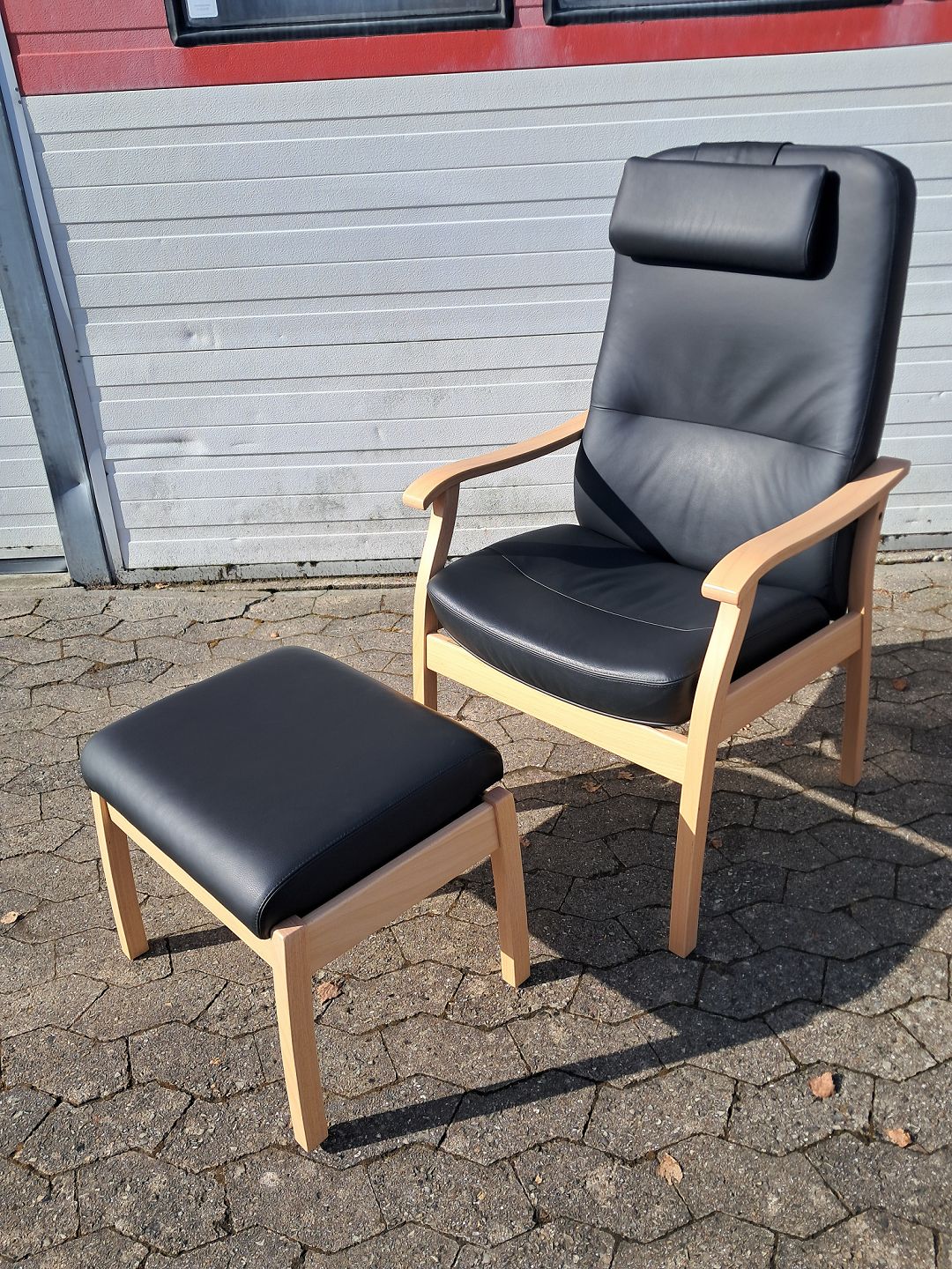 Farstrup lænestol og skammel i bøgetræ med læderbetræk, fra 2010erne.Den har små vbrugsspor.
