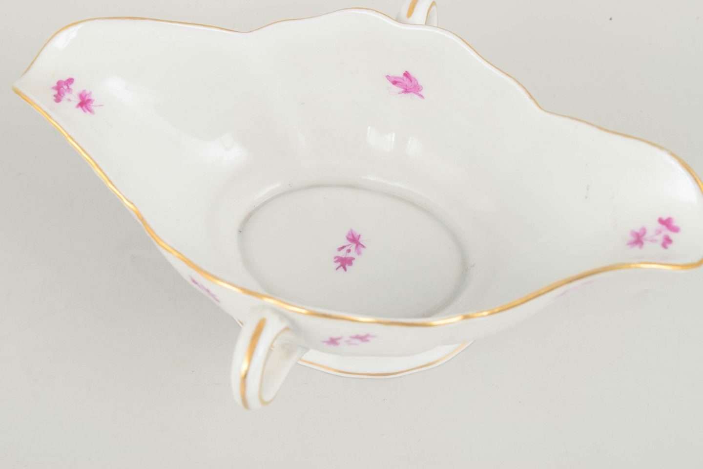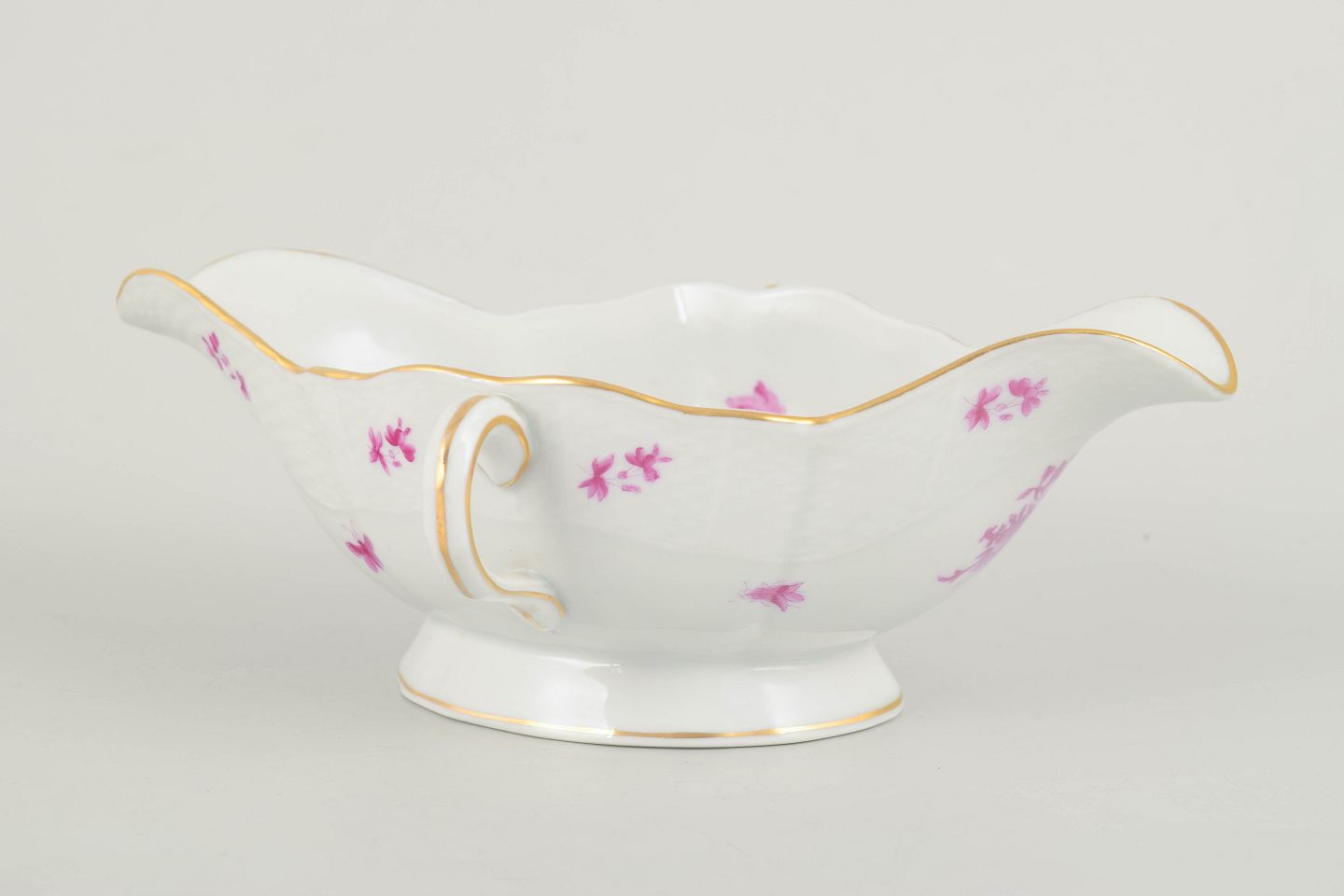 Herend Apponyi Pink, sauce boat.Elegant porcelain sauce boat from Herend decorated in the Apponyi Pink pattern with stylised floral motifs in pink tones and a finely gilded rim. The form is classical with gracefully curved sides and a pronounced handle, resting on a low foot. A refined example of the manufactory’s distinctive decoration and high level of craftsmanship from the mid-20th century.