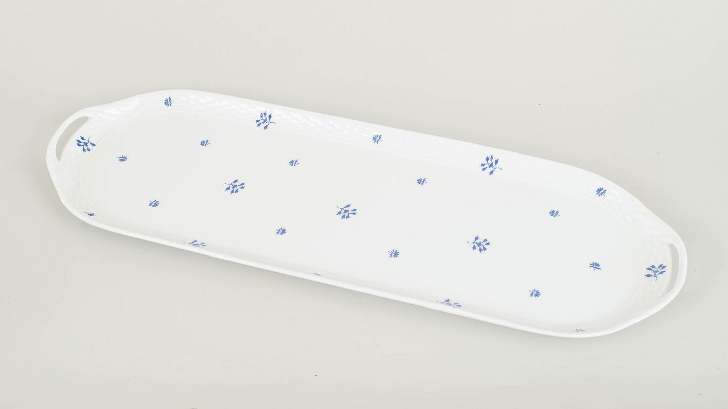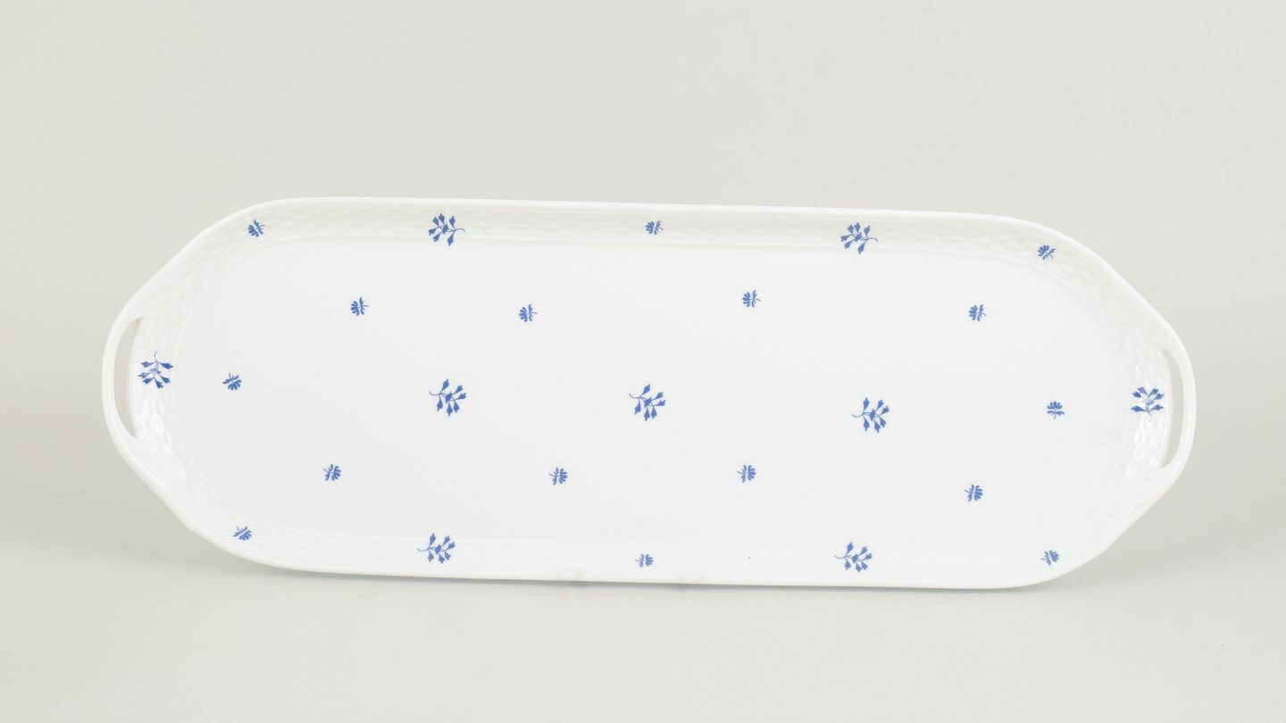 Herend, large tray.Impressive and elegant oval porcelain tray by Herend, executed with refined hand-painted decoration and delicate gilding along the rim. The tray displays classical proportions and a well-balanced form, characteristic of the manufactory’s interwar production. A distinguished and decorative serving piece from the 1930s.