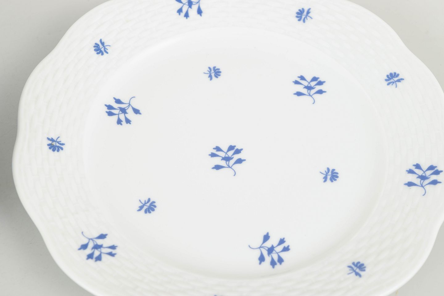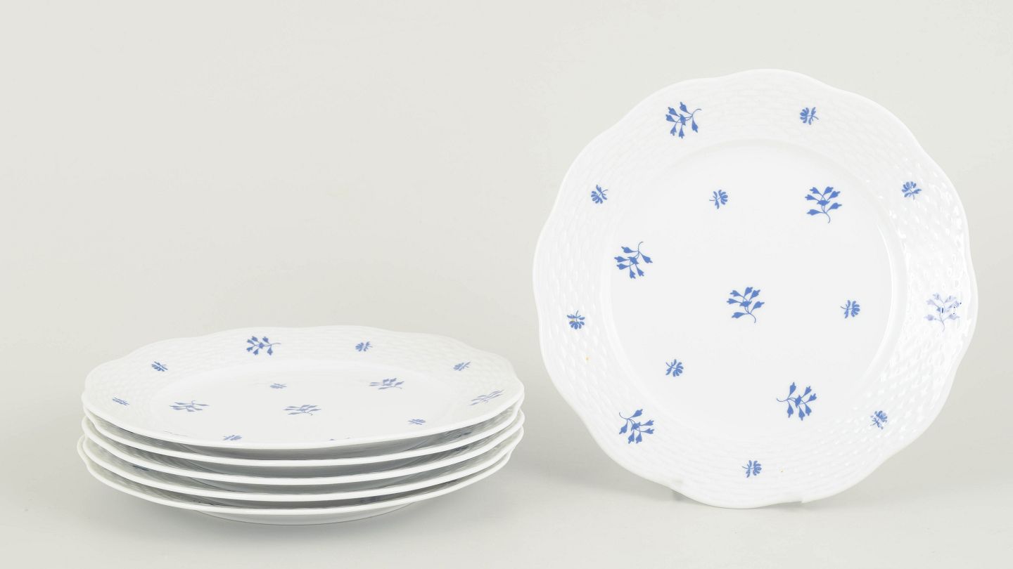 Herend, set of six plates.Elegant set of six hand-painted porcelain plates from Herend featuring a delicate blue floral motif scattered across the rim and centre. The gently scalloped edge and subtle relief pattern create a refined and classical appearance, characteristic of the manufactory’s interwar production. A harmonious and decorative service in a smaller format.