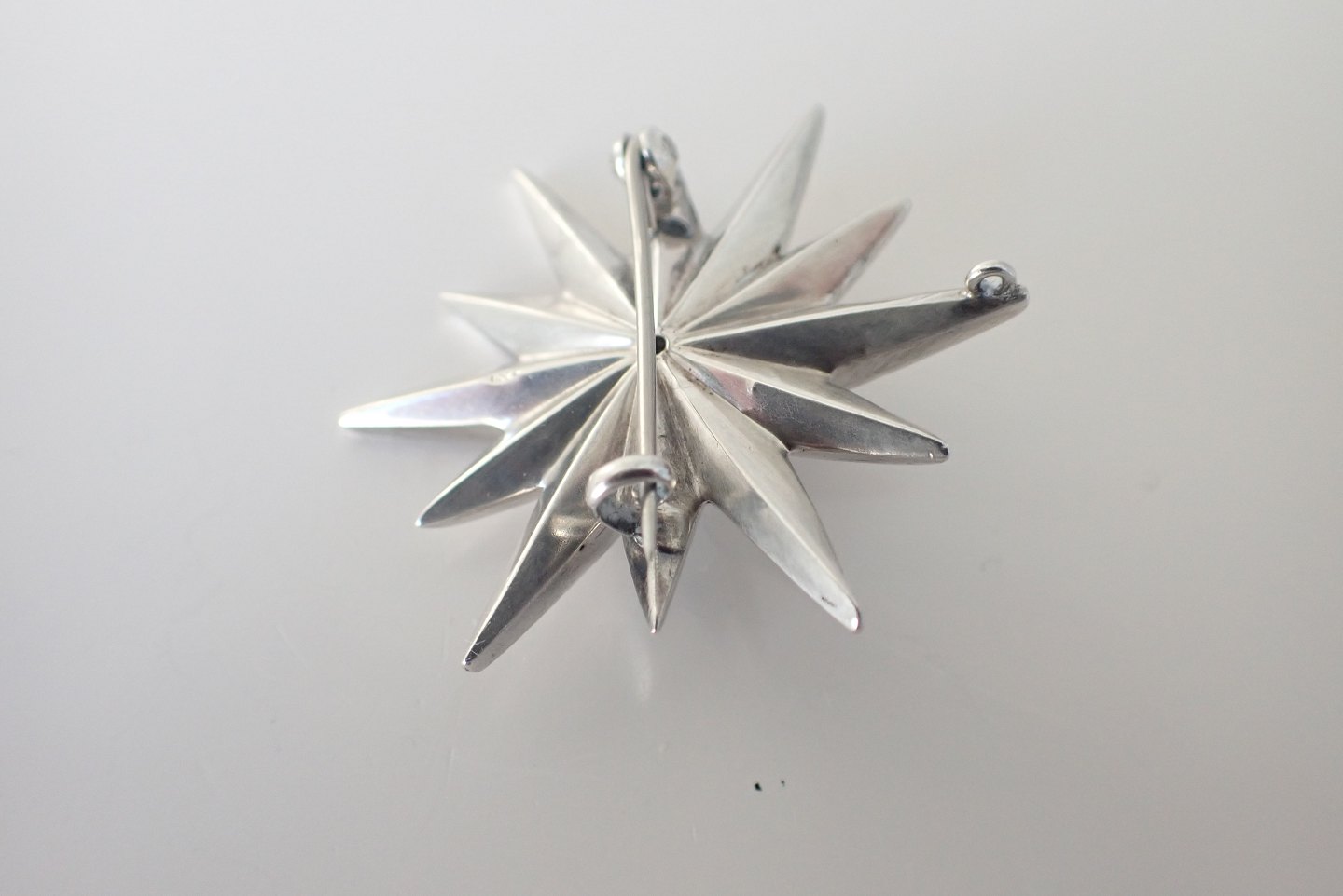 12 takket stjernebroche/ophæng i 900sølv med talrige diamantslebne zirkoner. Stemplet 900. Vægt 10 gram. Største diameter: 4 cm. I fin stand. Dealer
