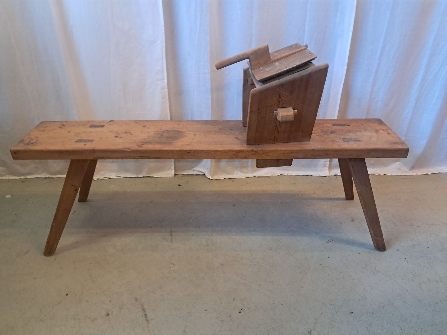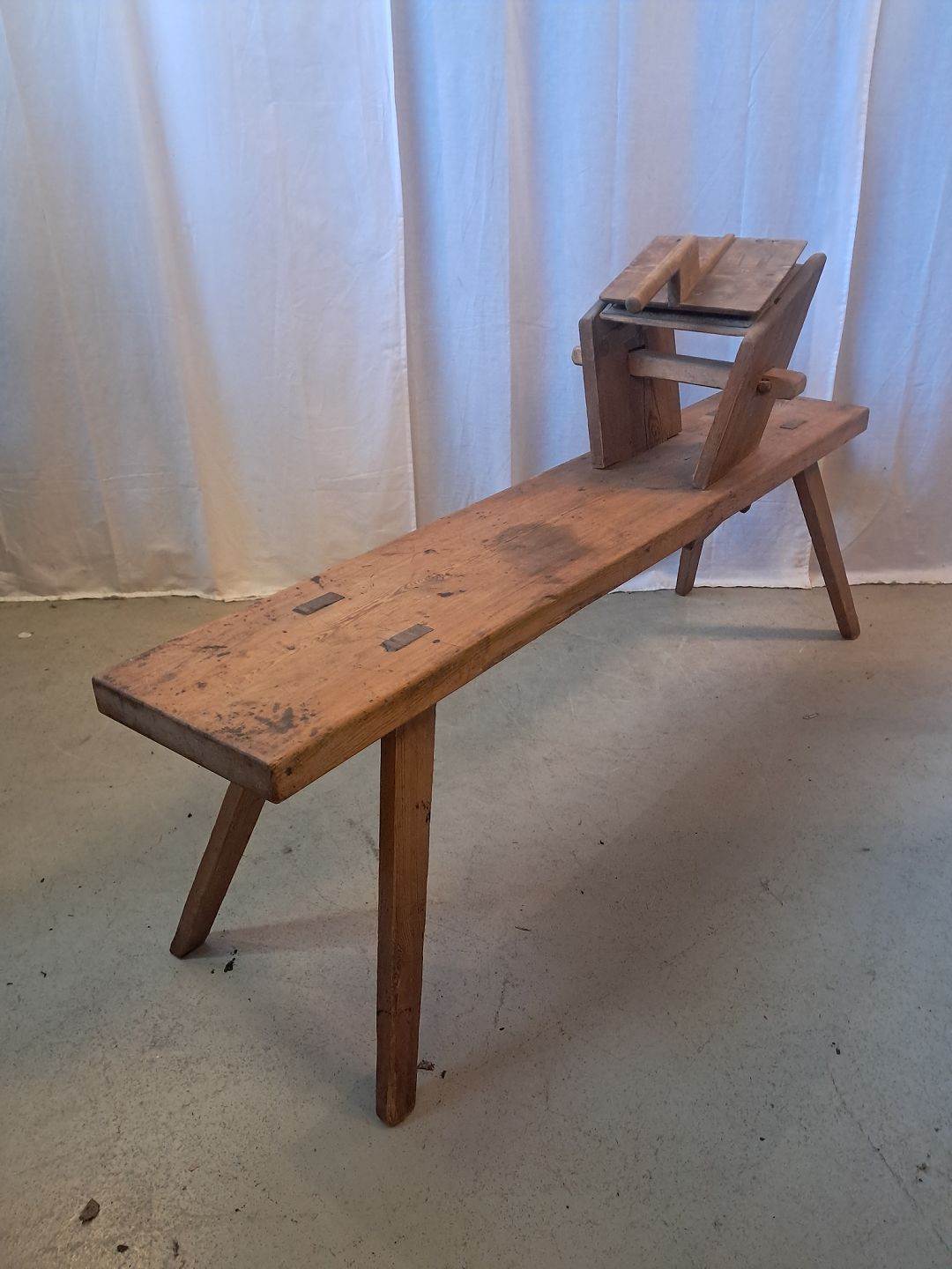 Bænk til uldkarding i massivt fyrretræ, fra 1910erne.Den har patina.