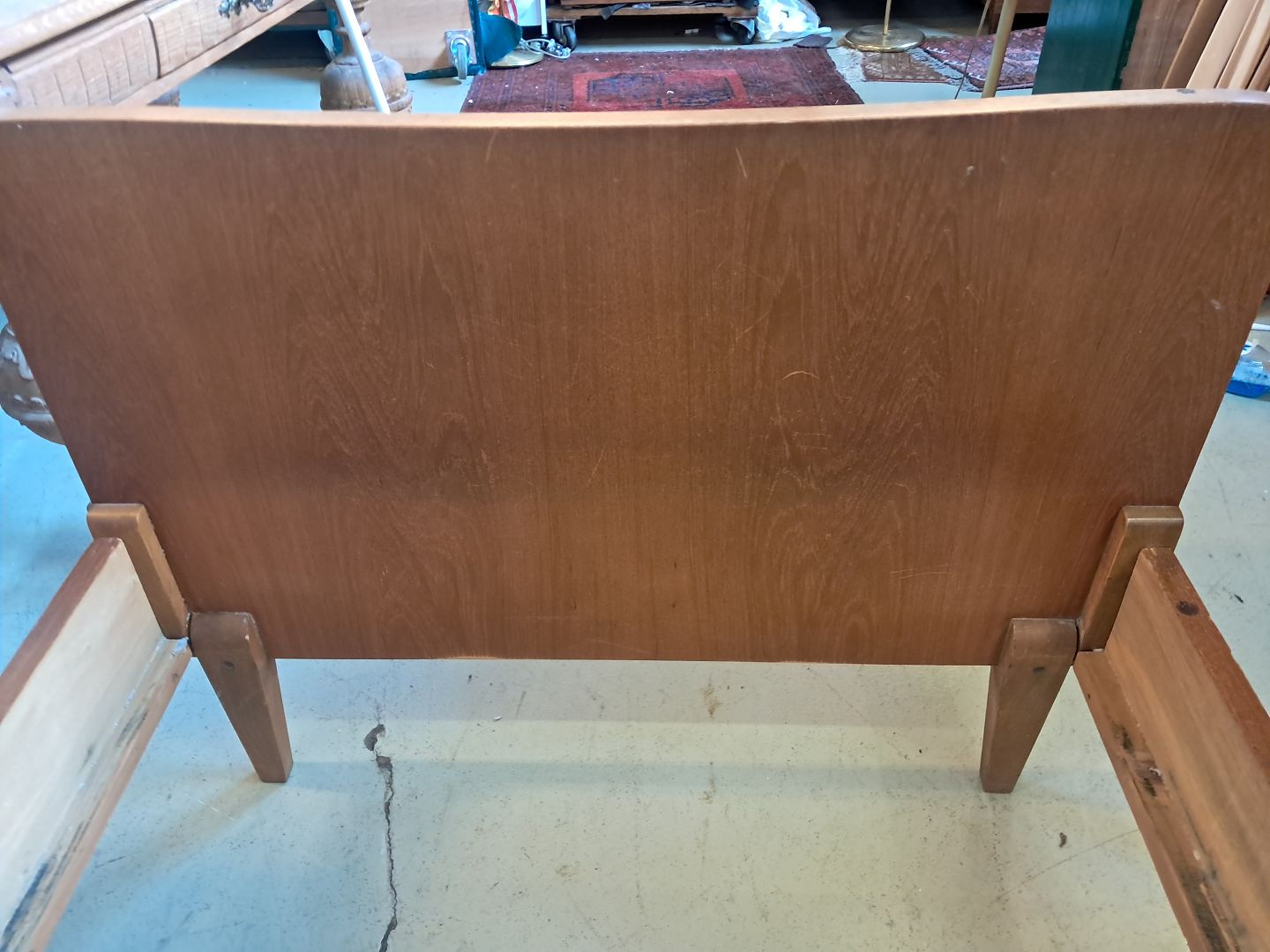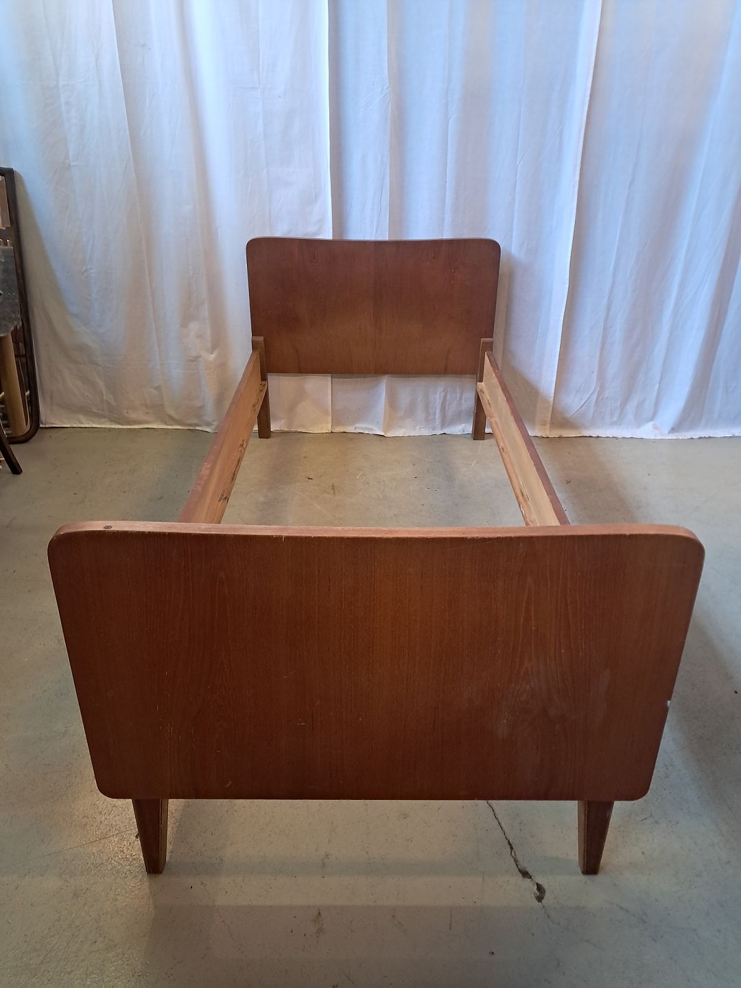 Seng i fineret teaktræ, fra 1960erne.Den har brugsspor og der medfølger ikke madras.
