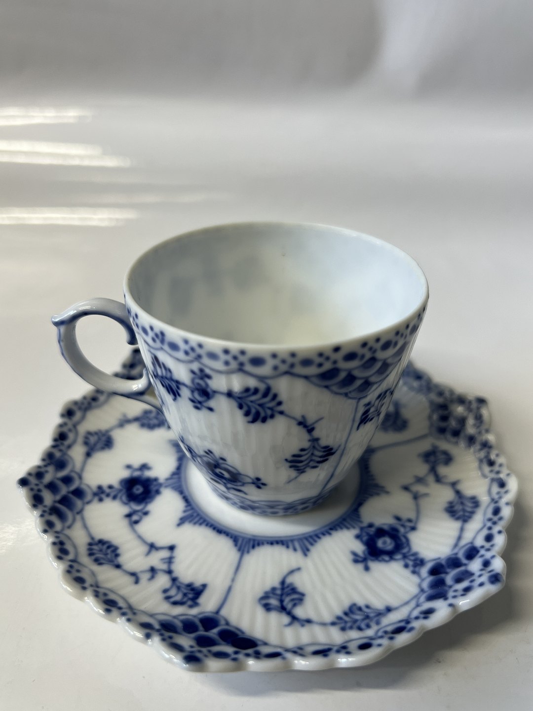 Royal Copenhagen Blue Fluted Lace, small espresso cup with accompanying saucer.Decoration number 1/1038.
