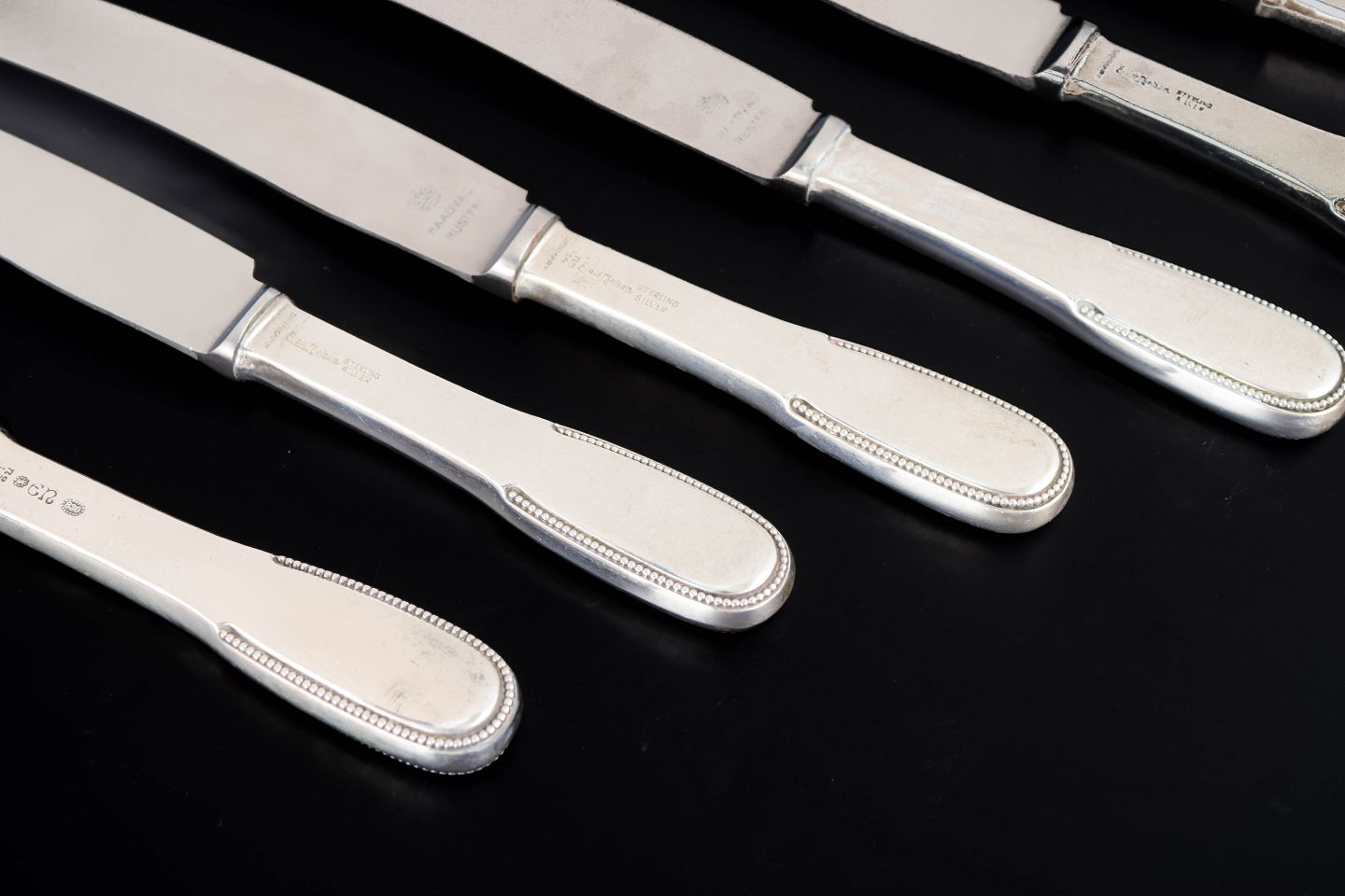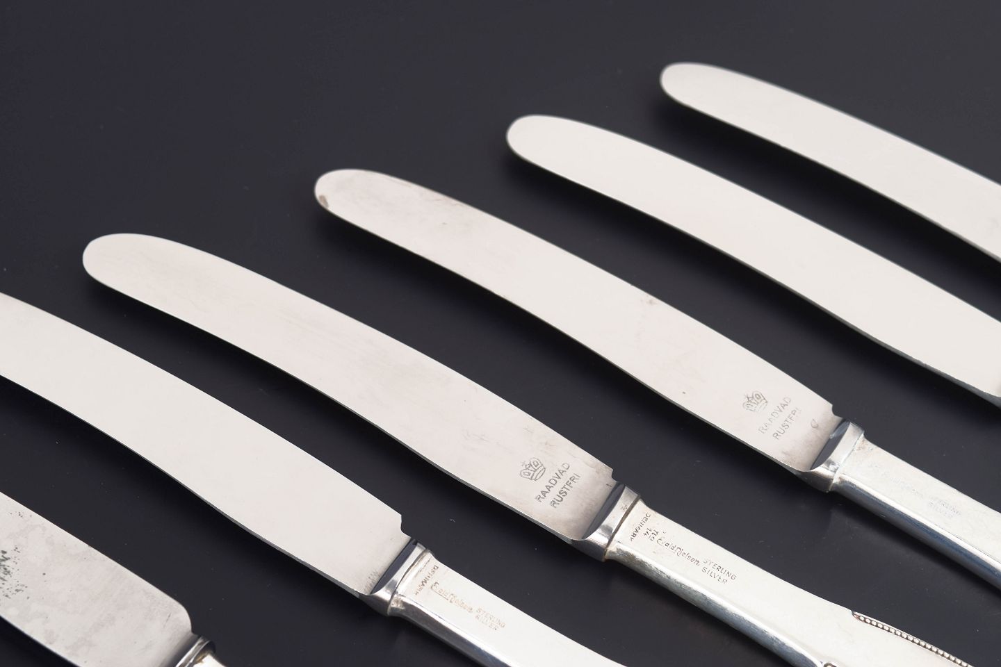 Evald Nielsen lunch knives, set of six. Model number 14Elegant lunch knives in sterling silver and stainless steel. Model number 14 with a classic softly rounded handle with a subtle beaded edge and plain blade. Produced by Evald Nielsen.