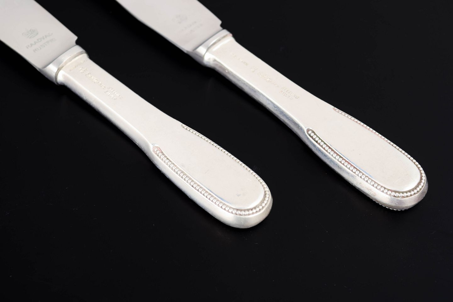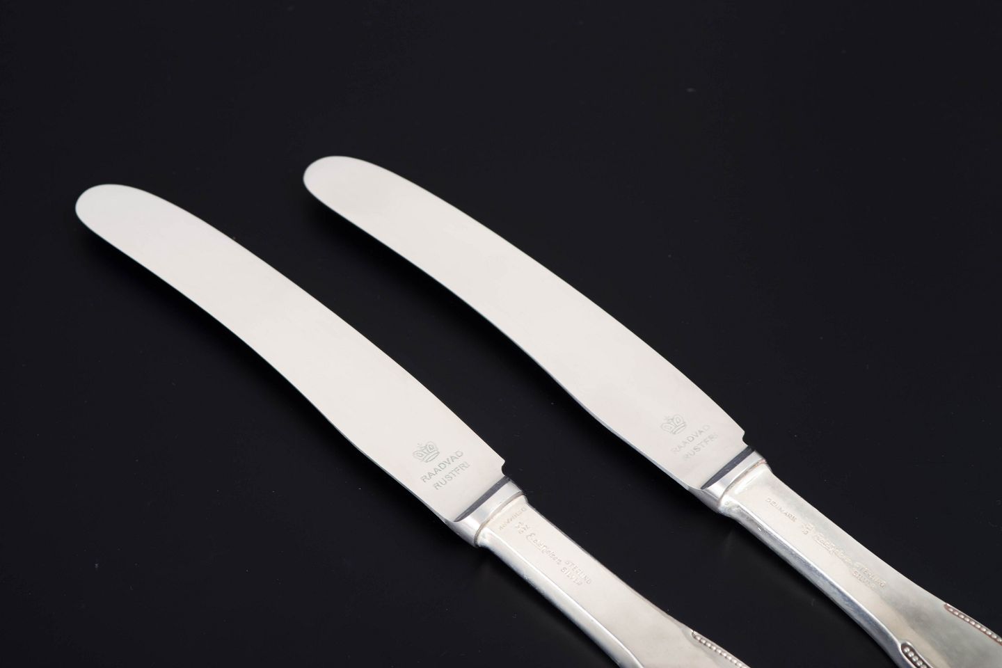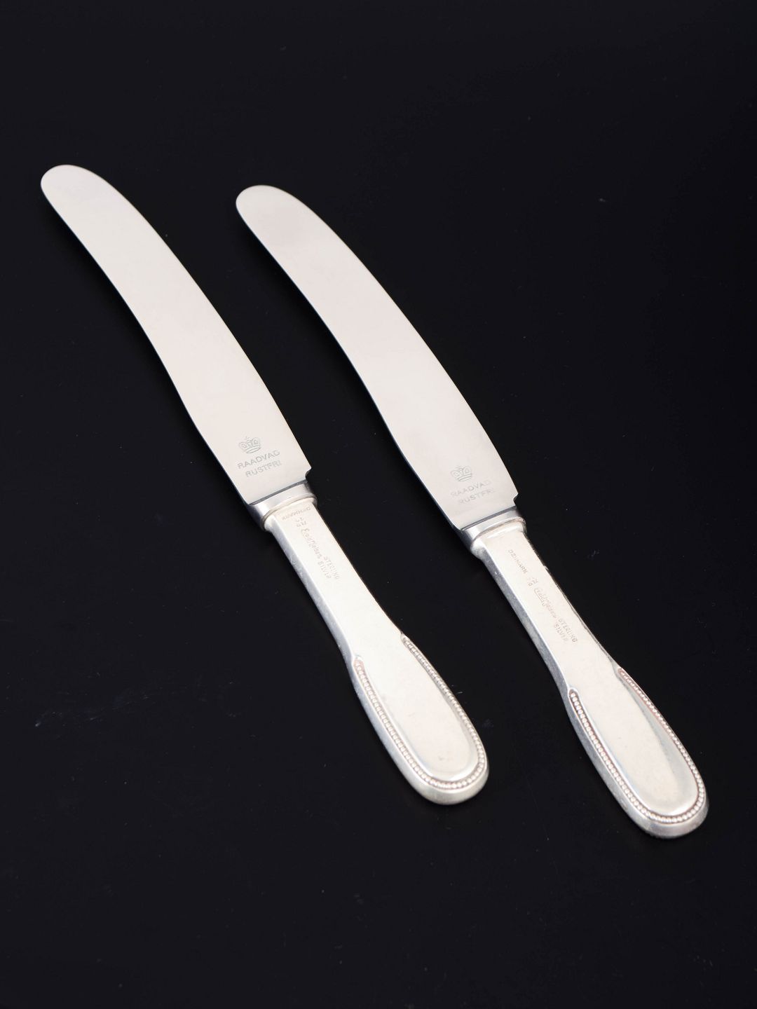 Evald Nielsen lunch knives, two pieces. Model number 14.Elegant lunch knives in sterling silver and stainless steel. Model number 14 with a classic softly rounded handle with a subtle beaded edge and plain blade. Produced by Evald Nielsen.
