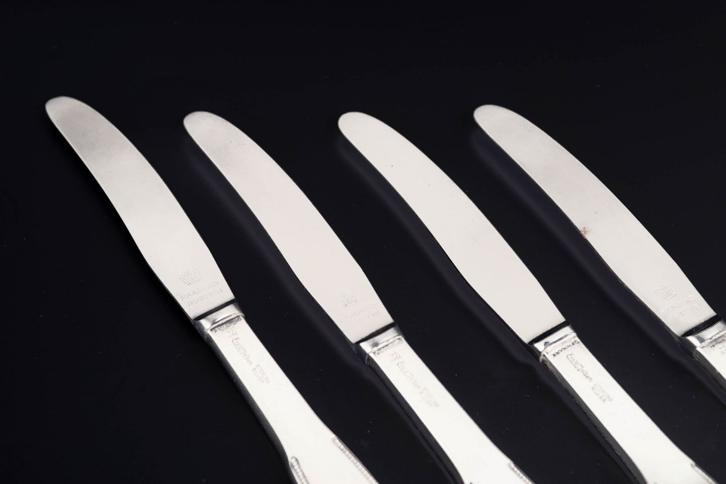 Evald Nielsen lunch knives, set of four. Model number 14.Elegant lunch knives in sterling silver and stainless steel. Model number 14 with a classic softly rounded handle and plain blade. Produced by Evald Nielsen, length 17.7 cm.
