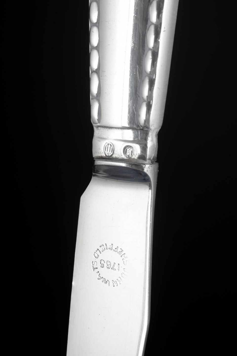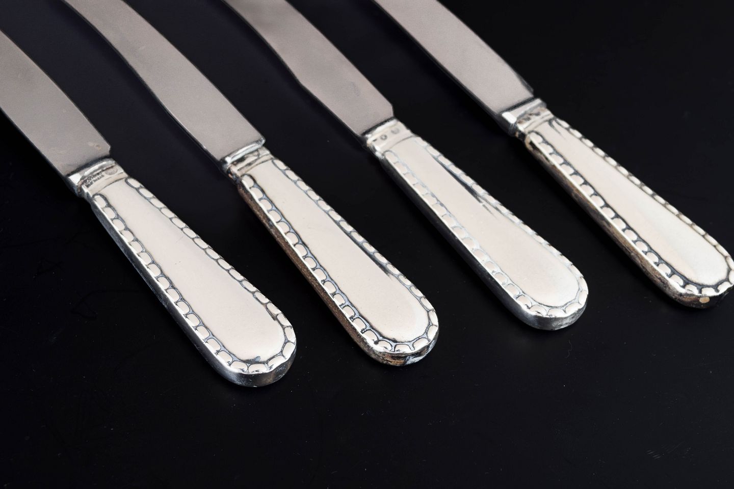 Georg Jensen, set of four knives, Beaded.Set of four knives in stainless steel and 830 silver in the Beaded pattern from Georg Jensen. The handles are decorated with a characteristic beaded border along the edge, a classic ornamental detail that gives the flatware an elegant and timeless appearance.