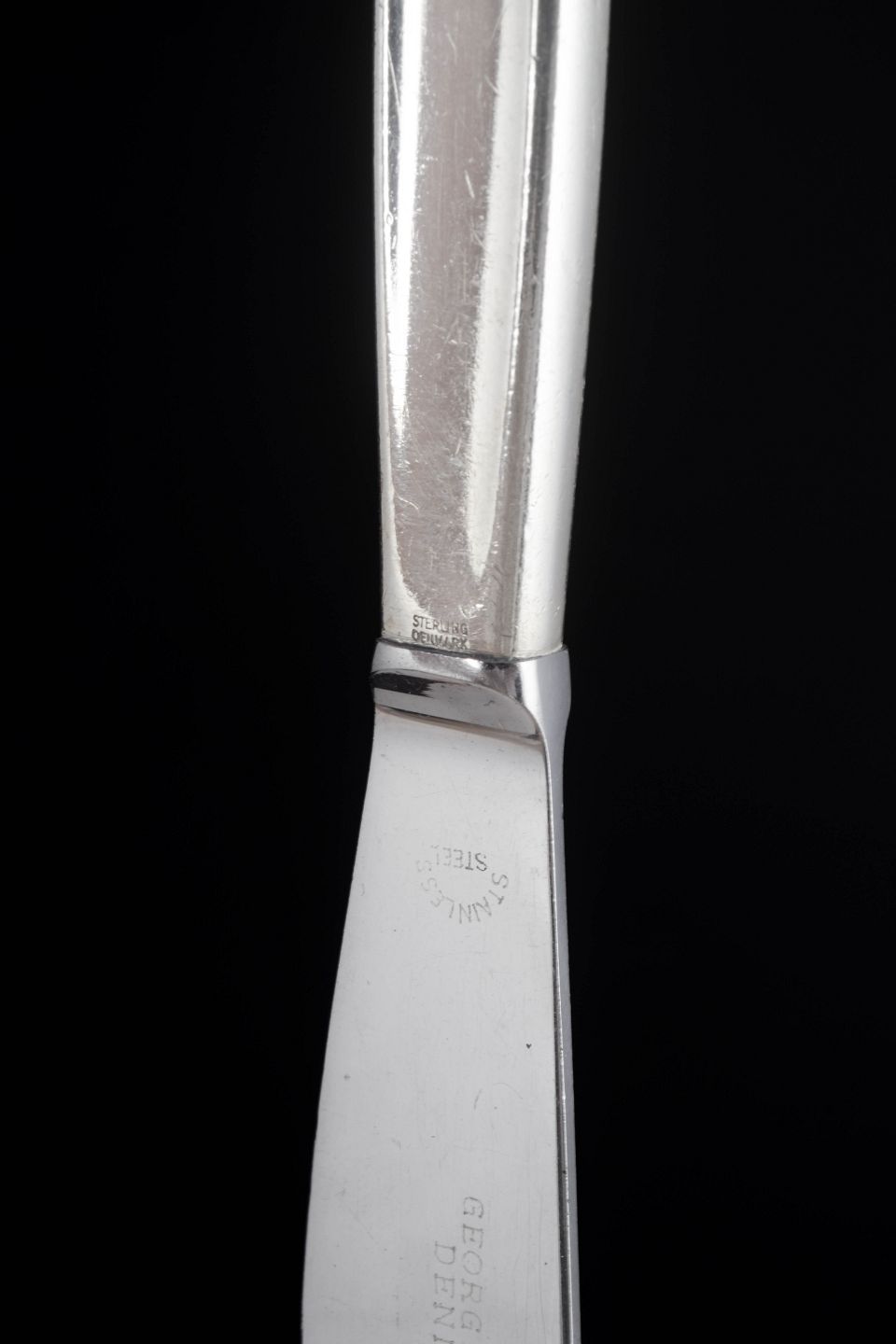Georg Jensen, two lunch knives, Cypress.Two lunch knives in stainless steel and sterling silver in the Cypress model from Georg Jensen. The design features a slender tapered form and smooth modern lines characteristic of Georg Jensen flatware from the post-war period.