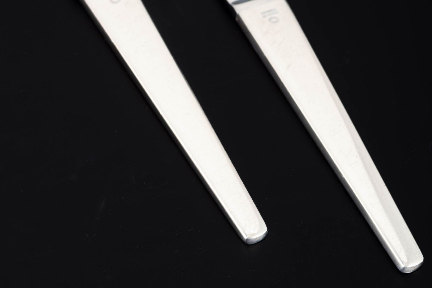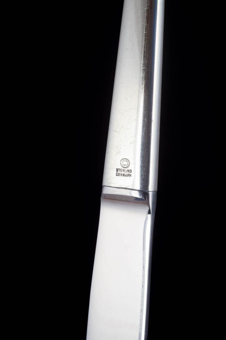 Henning Koppel for Georg Jensen, two small lunch knives Caravel.Two lunch knives in stainless steel and sterling silver in the Caravel model designed by Henning Koppel for Georg Jensen. The design features clean modern lines and a slender tapered form characteristic of Koppel’s functionalist approach to silverware design.