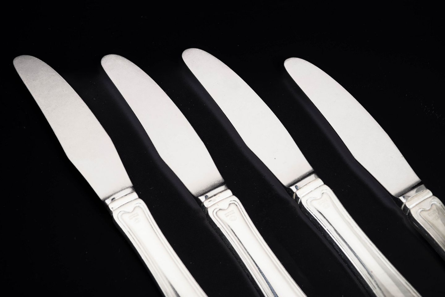 Georg Jensen, set of four lunch knives Old Danish.Set of four lunch knives in stainless steel and sterling silver with handles in the Old Danish pattern. The knives feature slender stainless steel blades and elegant silver handles with the characteristic double reeded border that defines this classic Georg Jensen design.