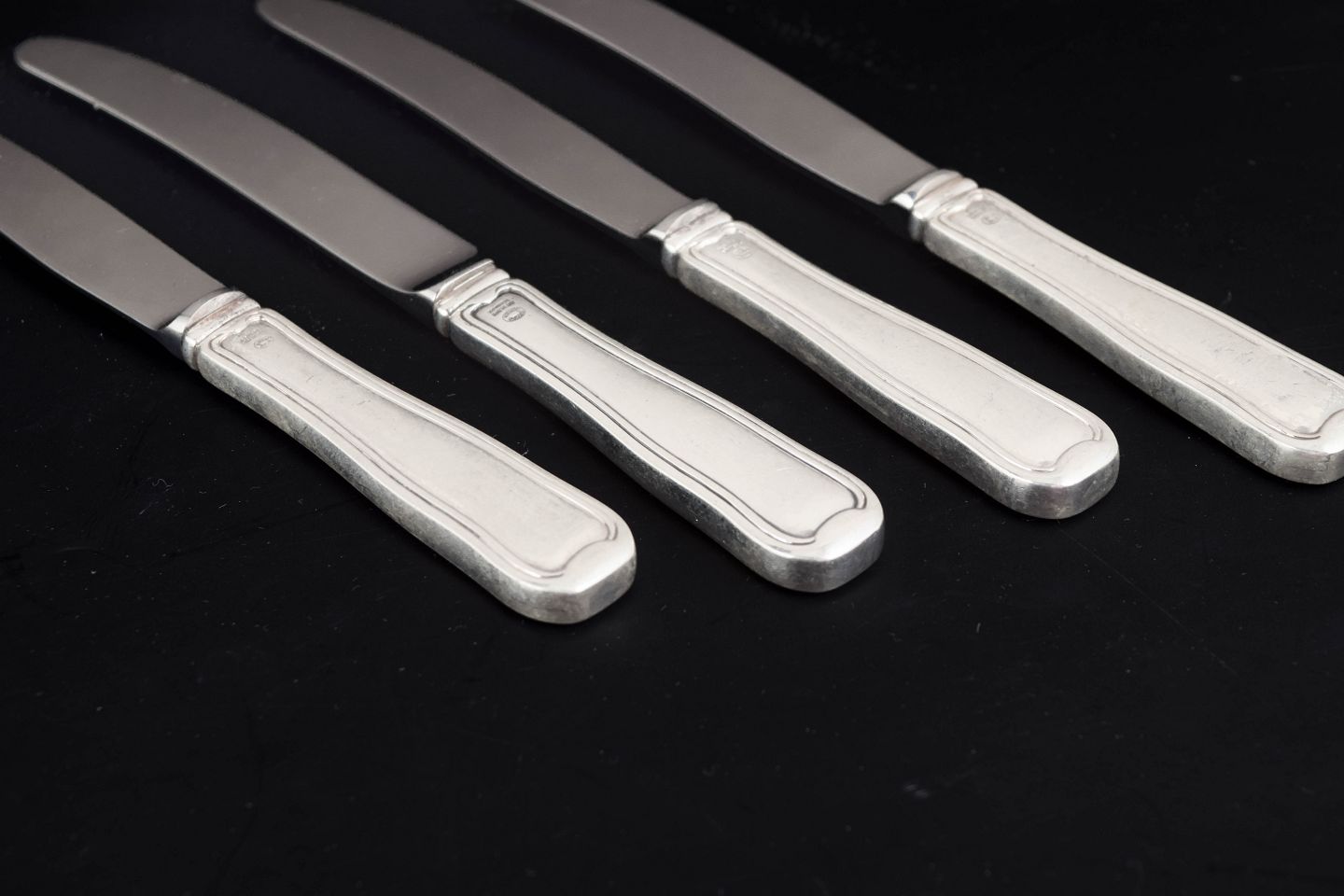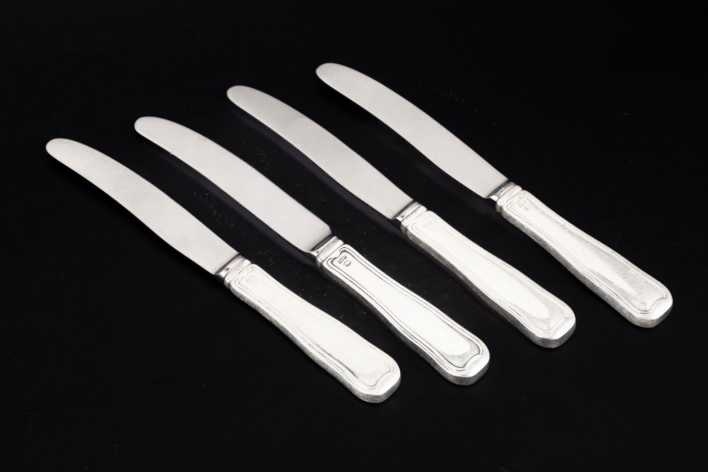 Georg Jensen, set of four fruit knives, Old Danish.Set of four fruit knives in stainless steel and sterling silver with handles in the Old Danish pattern. The knives feature slender stainless steel blades and elegant silver handles with the characteristic double reeded border that defines this classic Georg Jensen design.