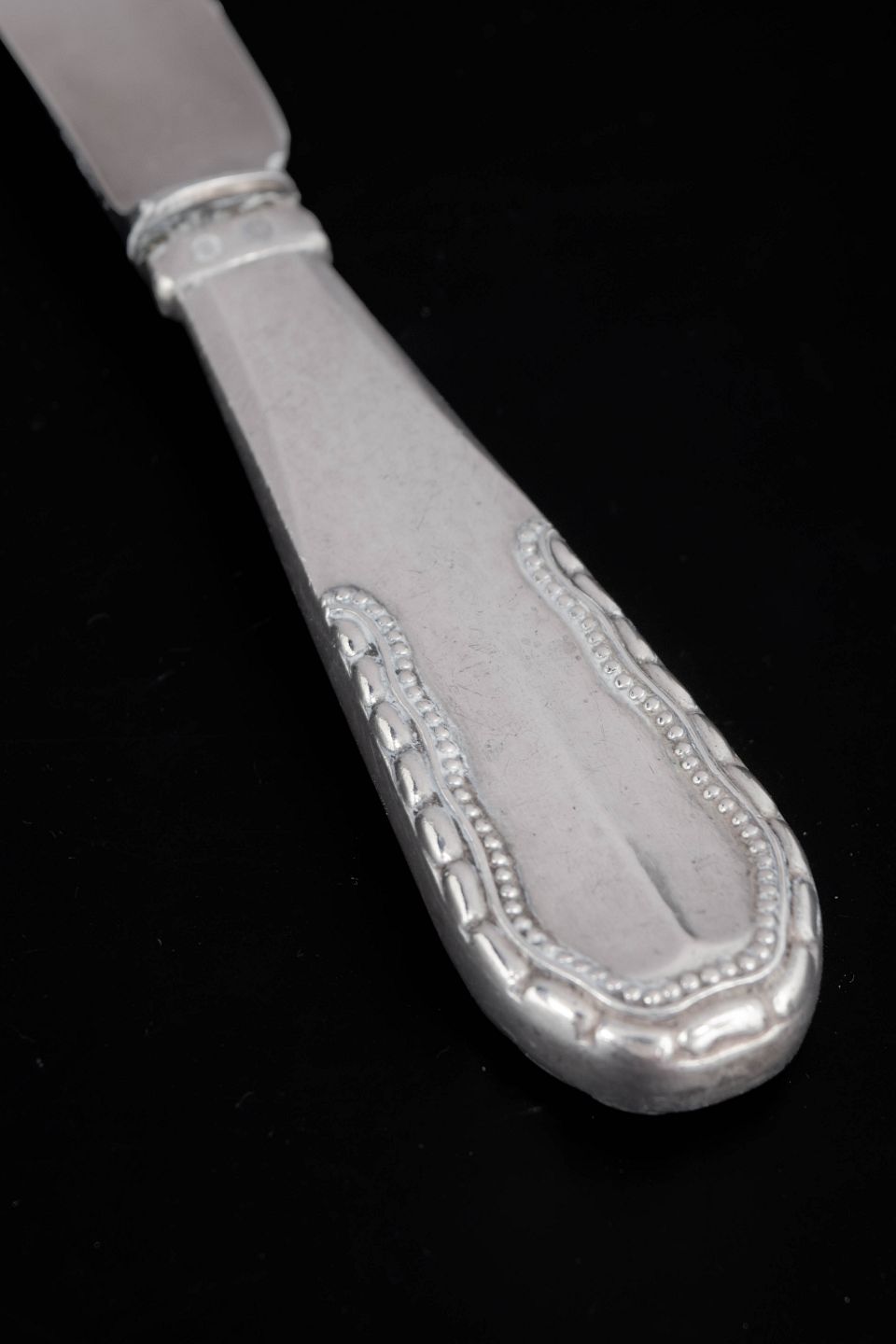 Georg Jensen, fruit knife Viking.Elegant fruit knife in stainless steel and 830 silver with handle in the Viking pattern. The knife features a slender stainless steel blade and a characteristic silver handle with softly rounded forms and decorative border. Produced by Georg Jensen in 1929 and marked with the Danish three-tower silver hallmark.
