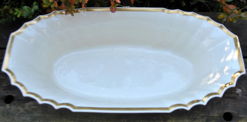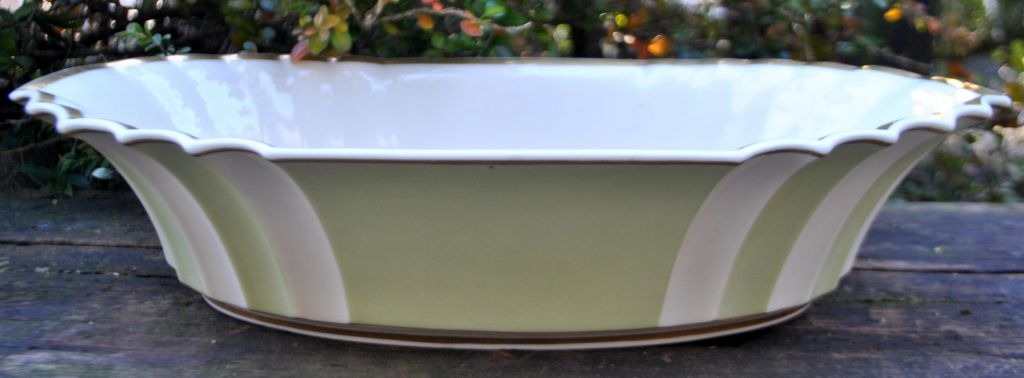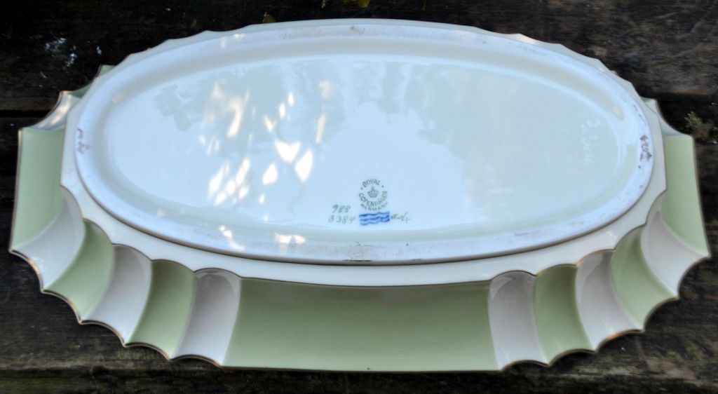 Royal Copenhagen jardiniere 988/3384, 20th century. Copenhagen, Denmark. Cream-colored with green background and gilding. Stamped. H: 9.3 cm. L: 37.5 cm. W: 19.5 cm.Item number: 29050