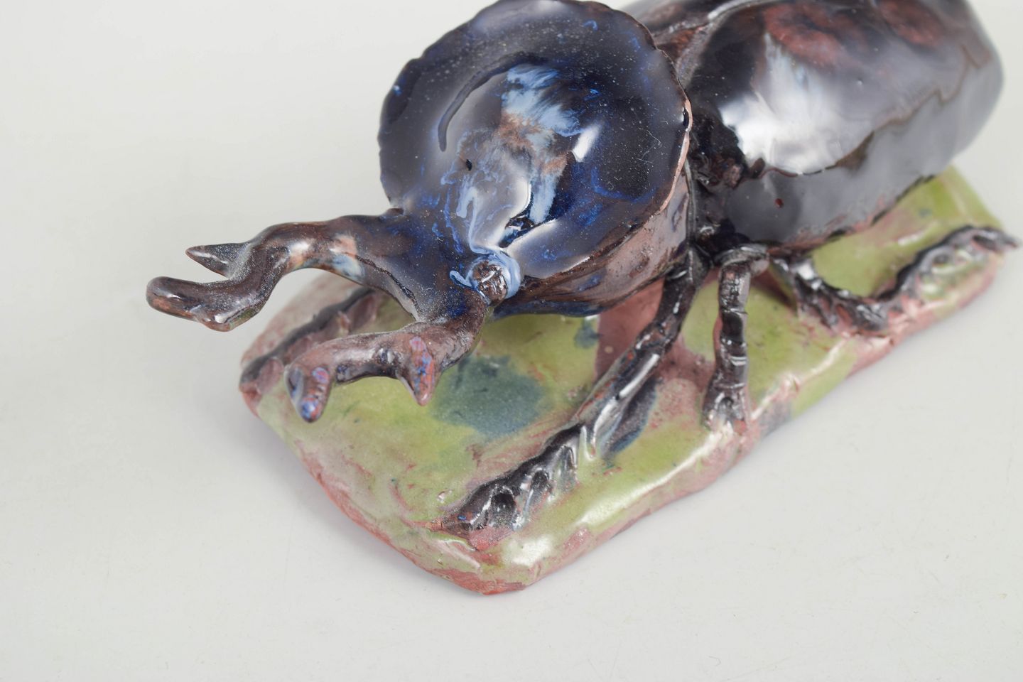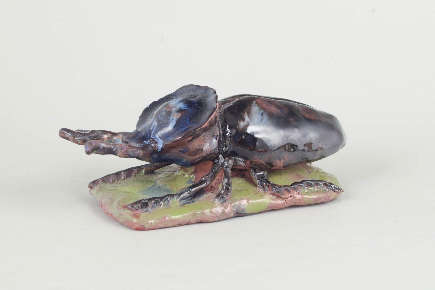 Nils-Erik Zetterström, insect figure.Unique ceramic sculpture depicting an insect executed in stoneware with glossy, iridescent glaze in dark blue, brown and green tonal nuances. The figure is modelled with naturalistic detailing and placed on a small clay base, giving the piece a lively and sculptural character. Signed and dated 1977.