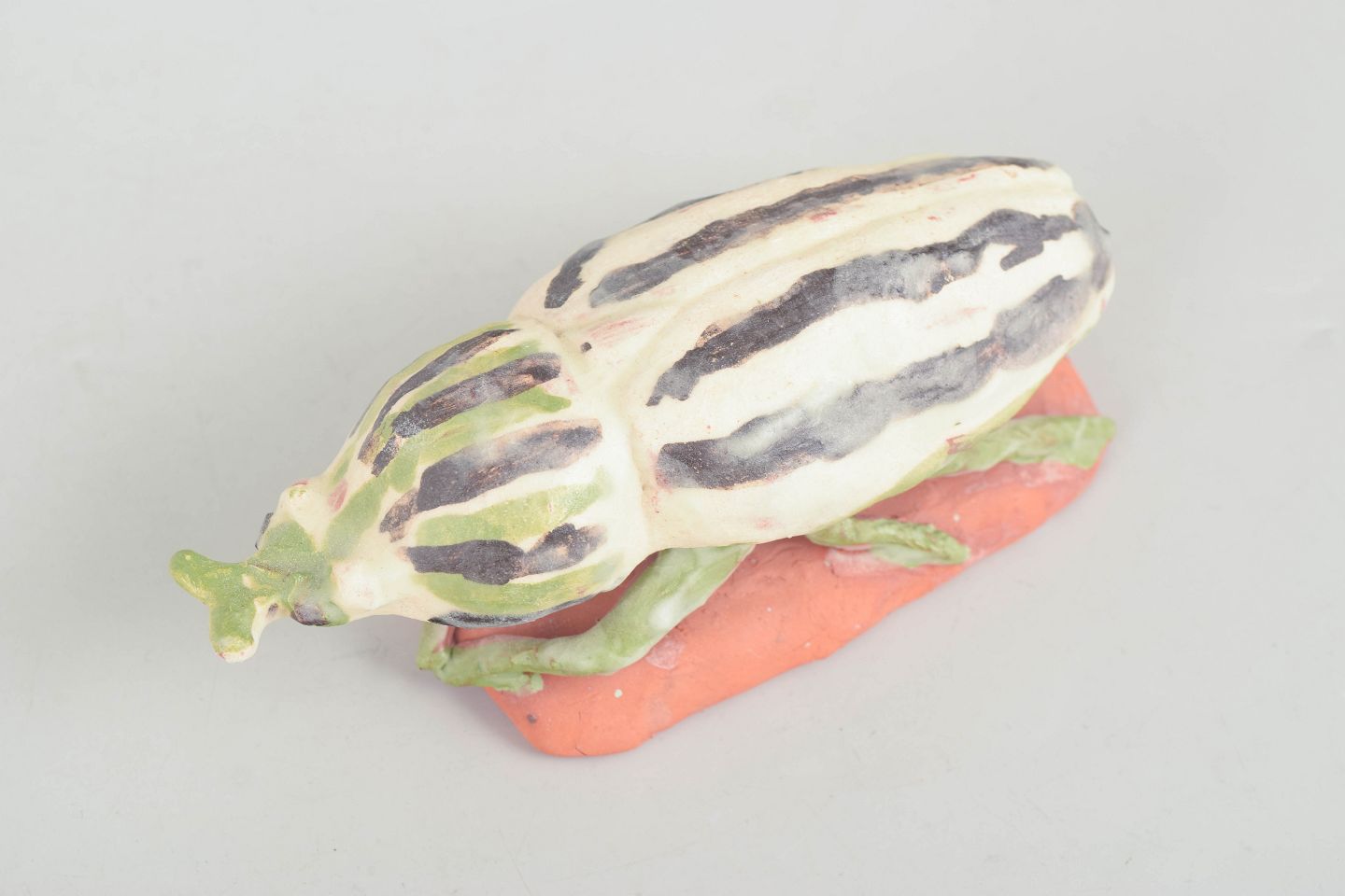 Unique ceramic sculpture depicting an insect executed in stoneware with light glaze decorated with green and darker tonal accents. The figure is modelled in a stylised naturalistic form and placed on a small clay base, giving the piece a sculptural and lively character. Unsigned unique work from the 1970s.