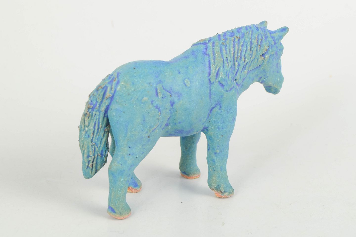 Nils-Erik Zetterström, pony figure.Unique ceramic sculpture depicting a pony executed in stoneware with blue-green glaze and subtle tonal variations across the surface. The figure is modelled with a natural posture and detailed mane and tail, giving the piece a lively and expressive character. Unsigned unique work from the 1970s.