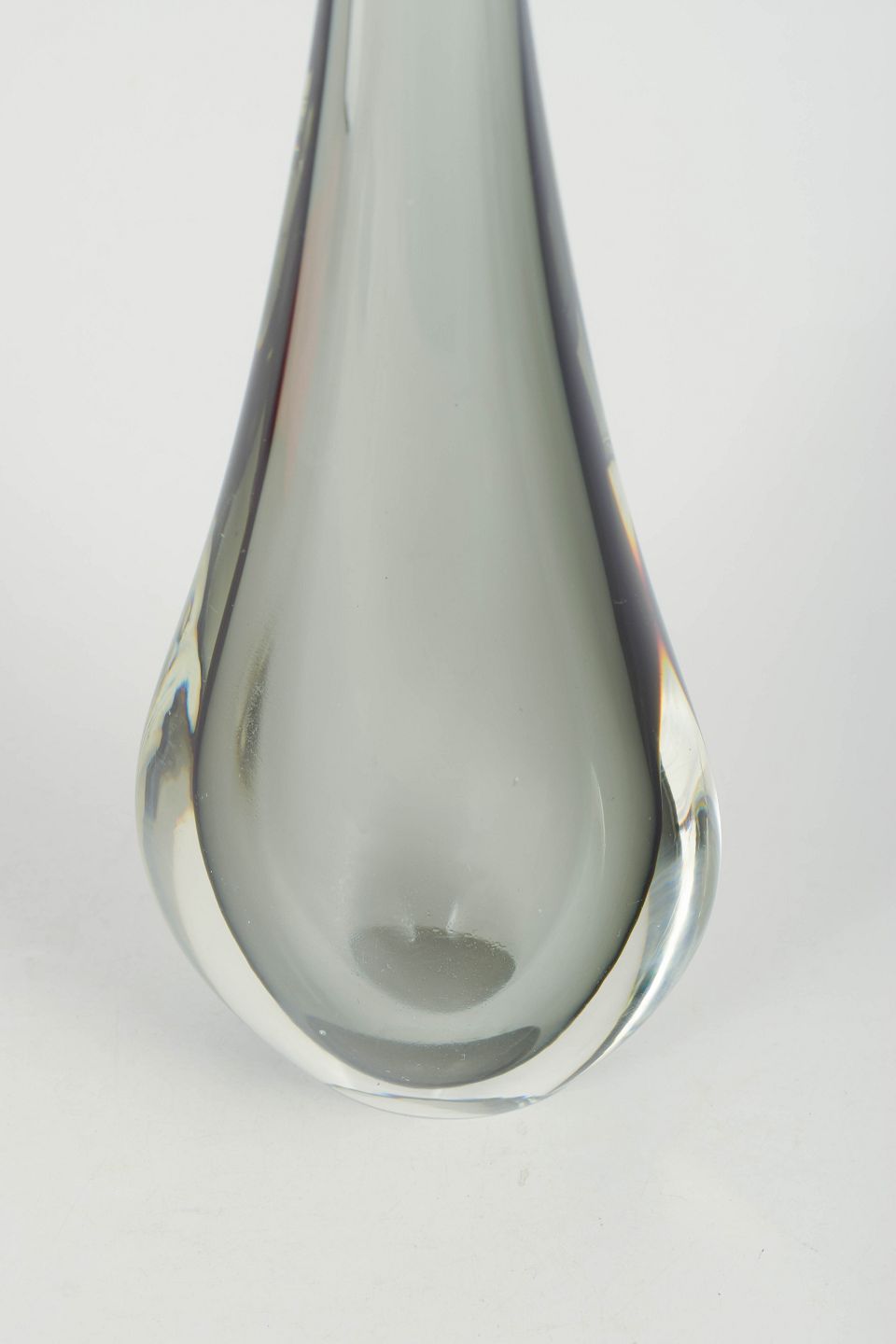 Murano, vase.Slender art glass vase in clear glass with elegant drop-shaped silhouette and long narrow neck, characteristic of Murano glass with a heavy base and refined sculptural form.