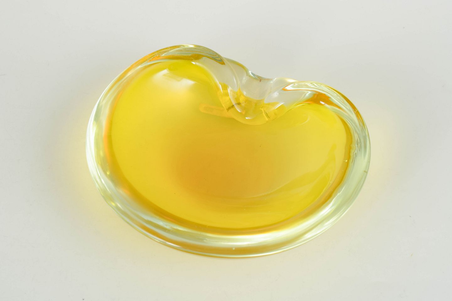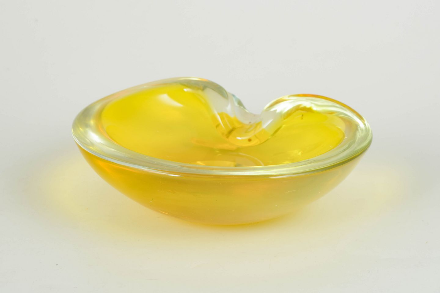 Murano, bowl.Organically shaped art glass bowl in yellow glass with clear rim and softly flowing form. Original label “Murano Glass – Made in Italy”.