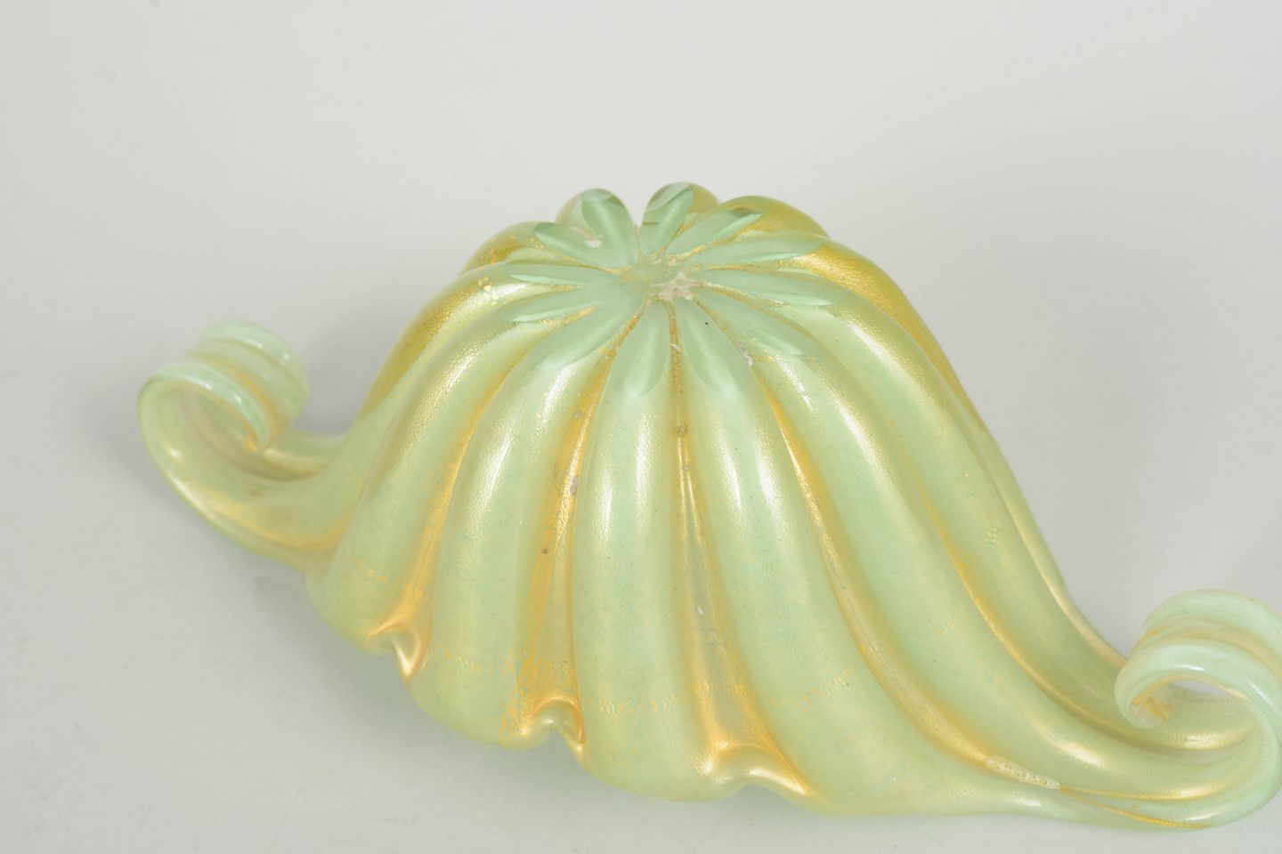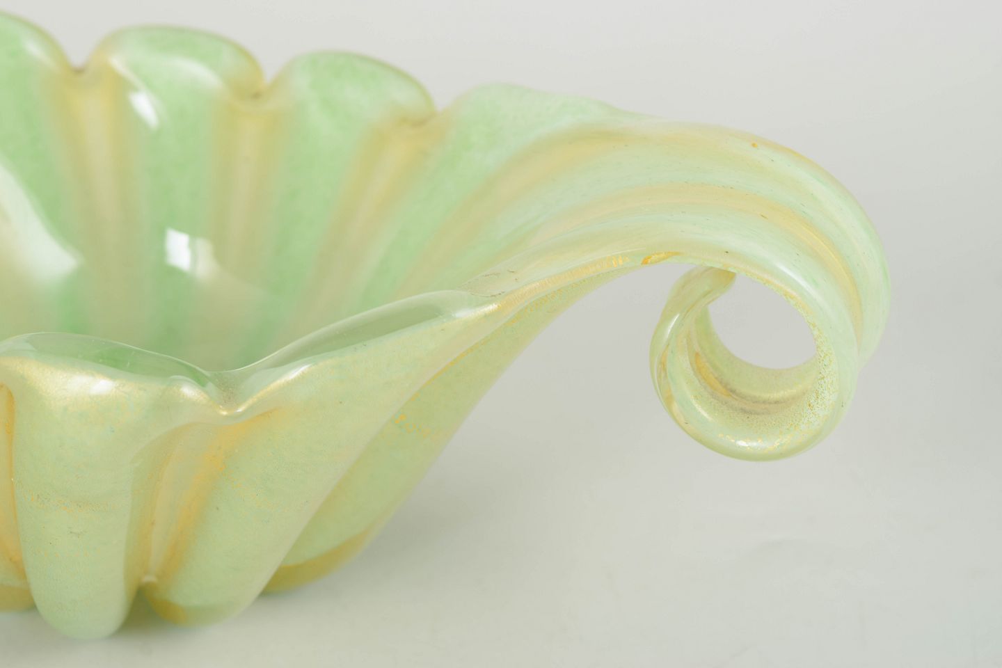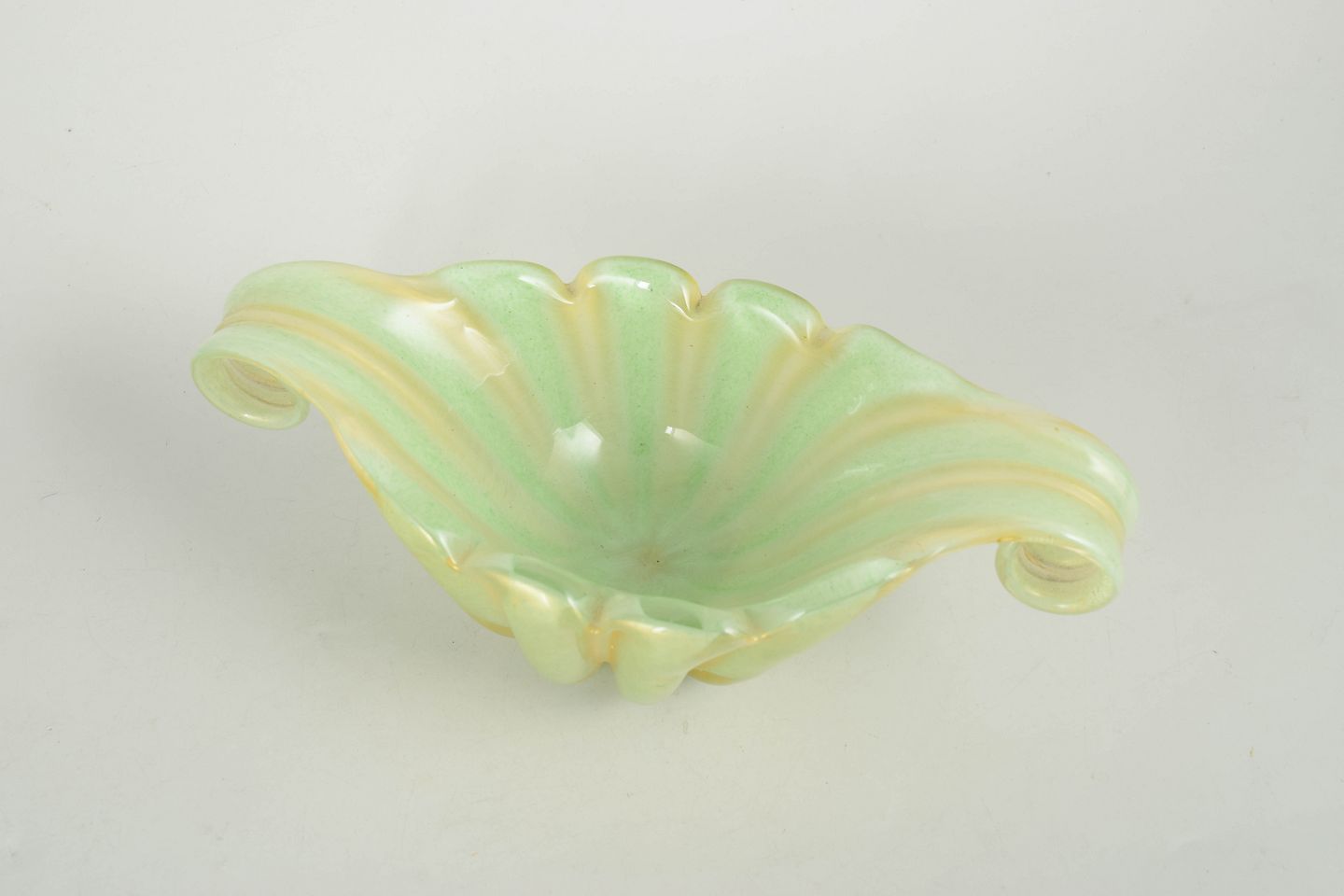 Murano, bowl.Decorative art glass bowl in iridescent glass with undulating body and elegantly upturned ends, produced in the characteristic Murano style with soft sculptural forms and a luminous surface.
