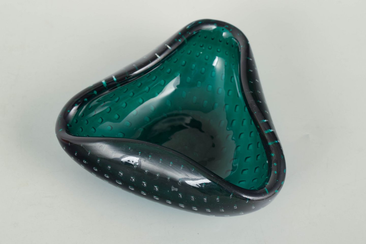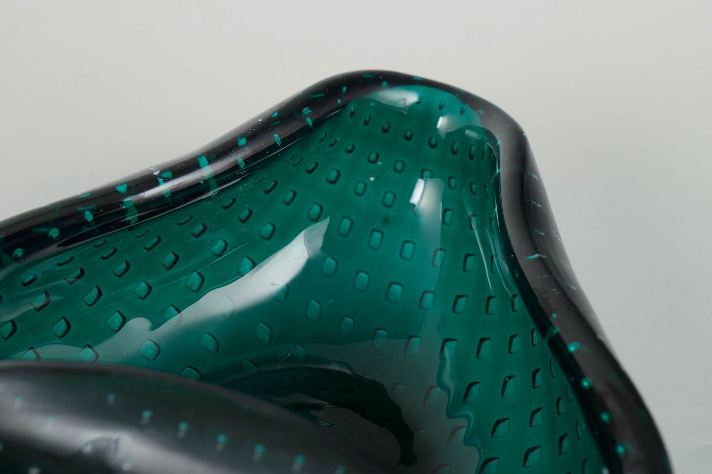 Murano, bowl.Organically shaped art glass bowl in green glass with controlled air bubbles and softly undulating rim, characteristic of Murano glass from the mid-20th century.